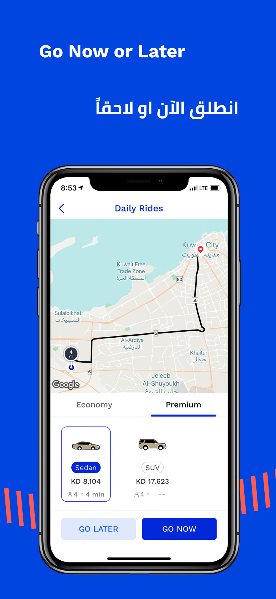 Looking for an affordable, fun and unique way to travel in Kuwait? Our aim is to make your journey as easy as possible. Be it on demand cabs, rentals or shared rides in a van, you are our number one priority. Simply add your destination and let us connect you with a compatible ride. It is fast, reliable and safe. Go anywhere in Kuwait quickly and without hassle, with our smart and secure ride booking app. Just register, book and go. It's as simple as that!