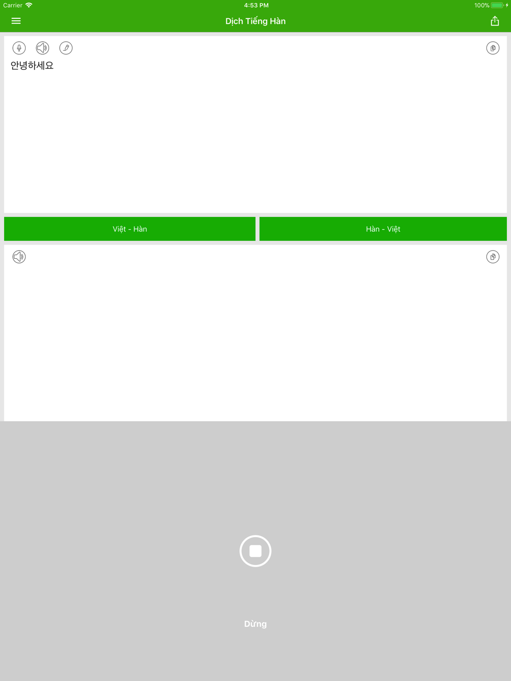 Hàn Việt phiên dịch - ứng dụng giúp bạn phiên dịch tiếng Hàn sang tiếng Việt . Bạn có thể sử dụng ứng dụng phục vụ cho việc học tập, nghiên cứu. Ngoài ra ứng dụng còn hỗ trợ đắc lực khi bạn đi du lịch, du học, nói chuyện với người nước ngoài.