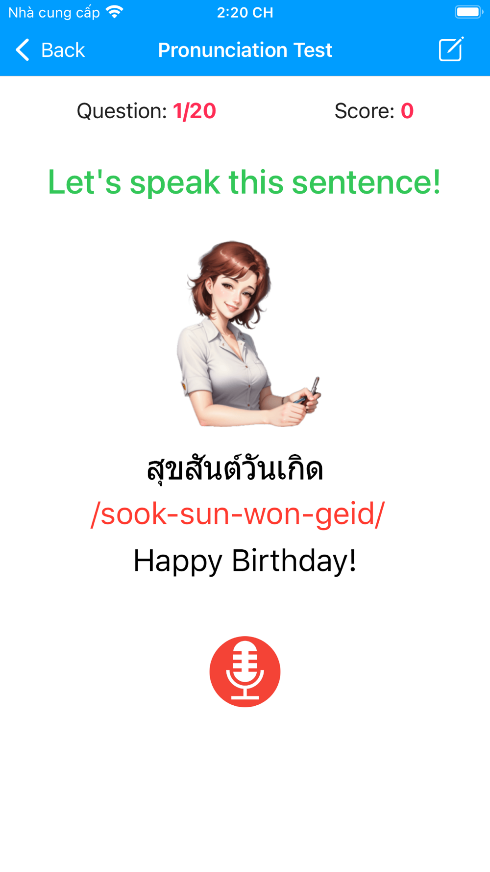 + Add 32 languages: Spanish, French, Arabic, German, Korean, Japanese....+ Add Test Pronunciation Tab+ New learn pronunciation with teacher AI+ Add new Interview, Works, Car Problems, Weather, Animal+ Fix Navigation for iOS 15,16+ Fix design for iPad