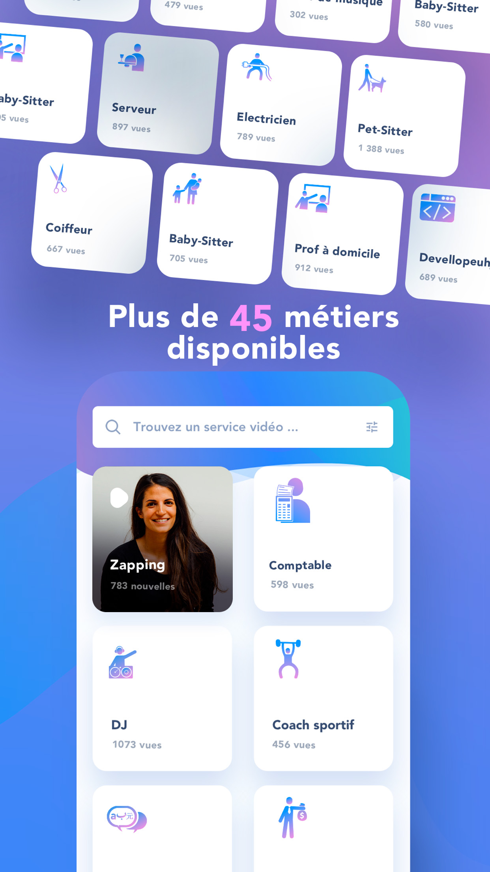 Sur notre application mobile, vous accédez à un défilement d'annonces et de CV vidéo ainsi qu'à des offres d'emploi vidéo, en un clic sur des catégories classées par types de métier, présentées sous deux pages d'accueil différentes : recrutez en vidéo & postulez en vidéo.
