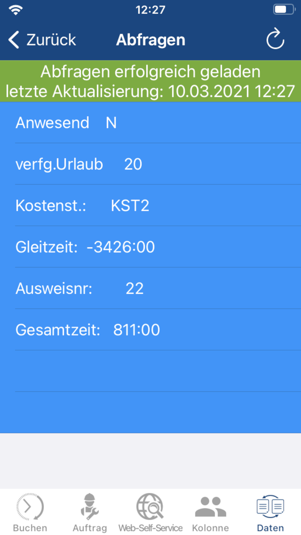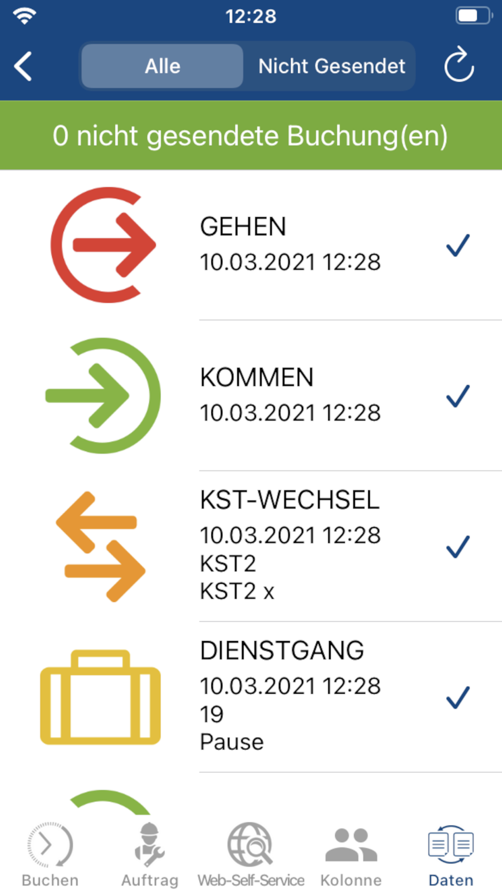 Buchungen können auch lokal gespeichert werden, wenn Ihnen kein Netz zur Verfügung steht. Sie senden sie einfach zu einem späteren Zeitpunkt über das Menü oder bei der nächsten Buchung automatisch.