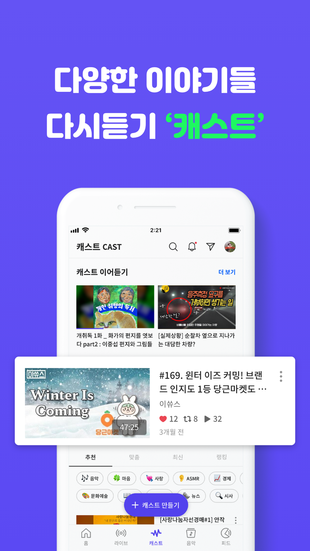 팟캐스트와 오디오 라이브, 생각과 의견을 공유하는 피드