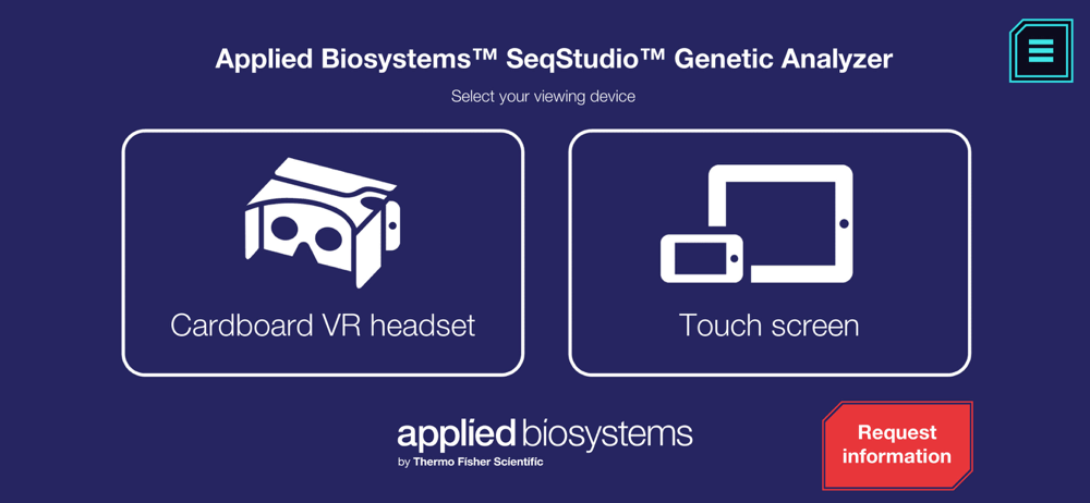 The first option is to place your mobile phone in a Cardboard VR headset where you will be able to perform a run on the SeqStudio instrument in Virtual Reality. This will bring you into a lab where you can see in 360 degrees and virtually run the instrument. The interactivity will happen using “gaze control,” or placing the center pointer on viewable targets.