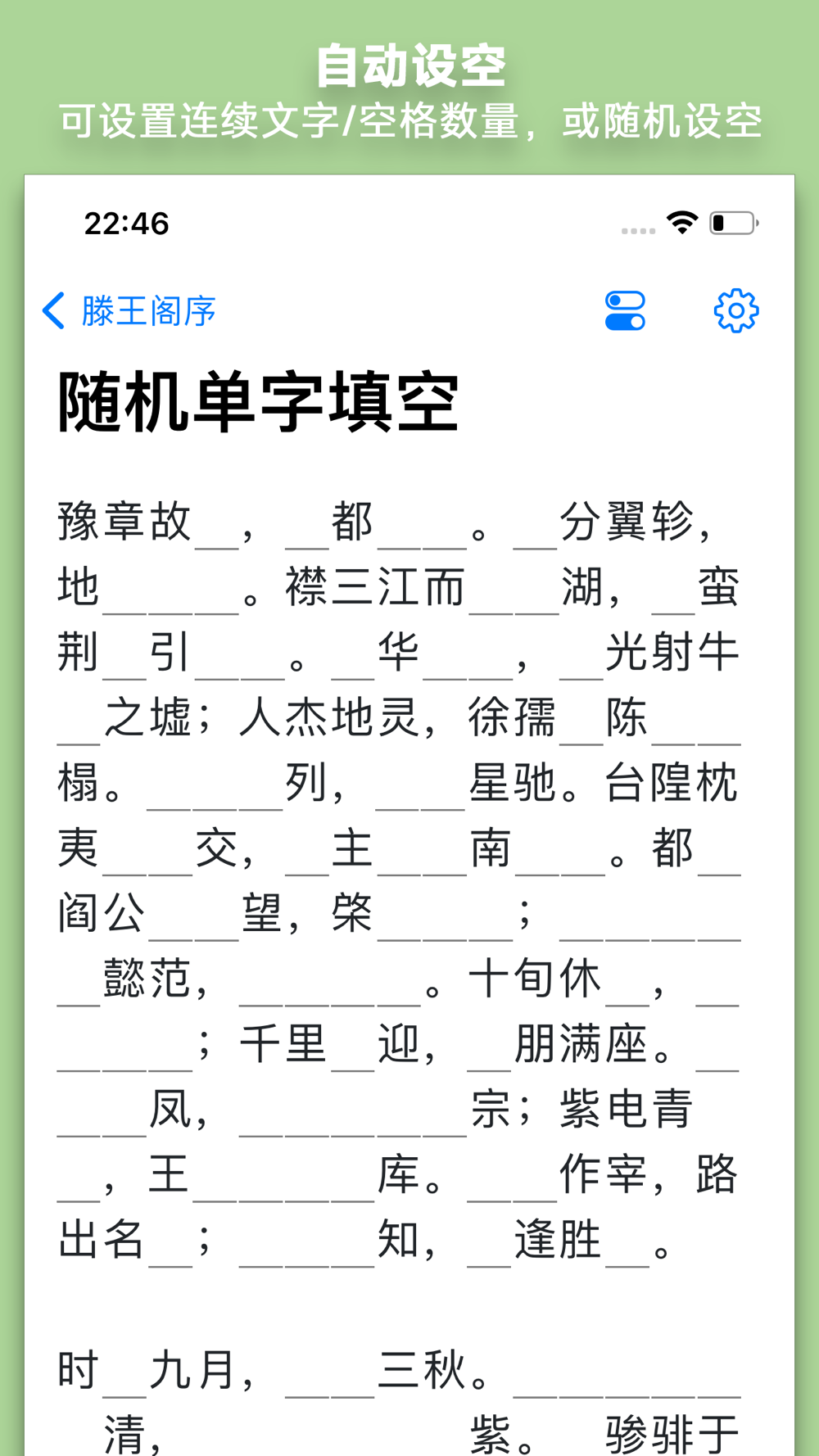 • 多种自动设空模式:固定设空数、随机设空、对调空格、句段首字词提示。