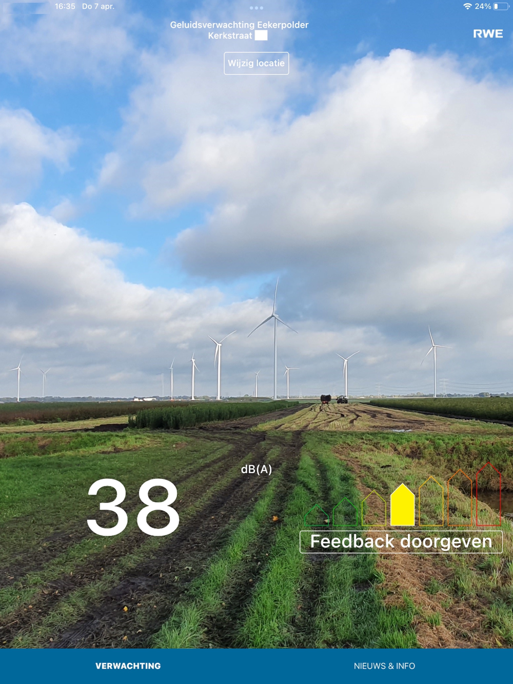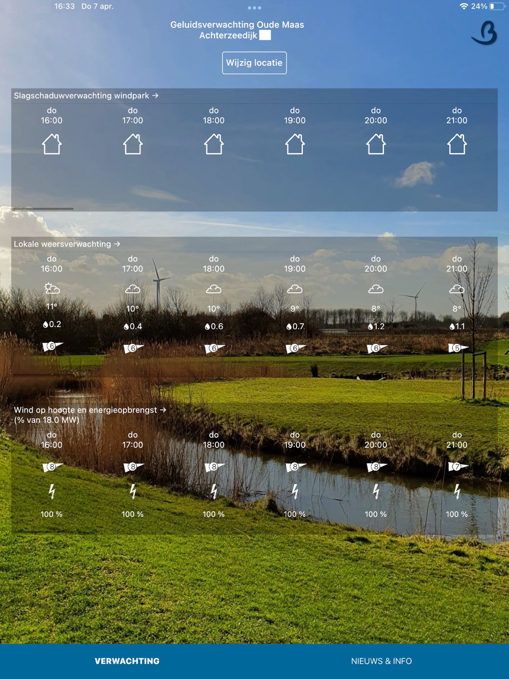 - Onze applicatie is voor u gratis, zonder reclame en zonder in-app aankopen. Er zitten geen addertjes onder het gras. Op de informatiepagina in de app is beschreven door welke partij de geluidsverwachting voor het windpark in uw omgeving wordt aangeboden. Dit is ook herkenbaar in het logo in de rechterbovenhoek van de app.