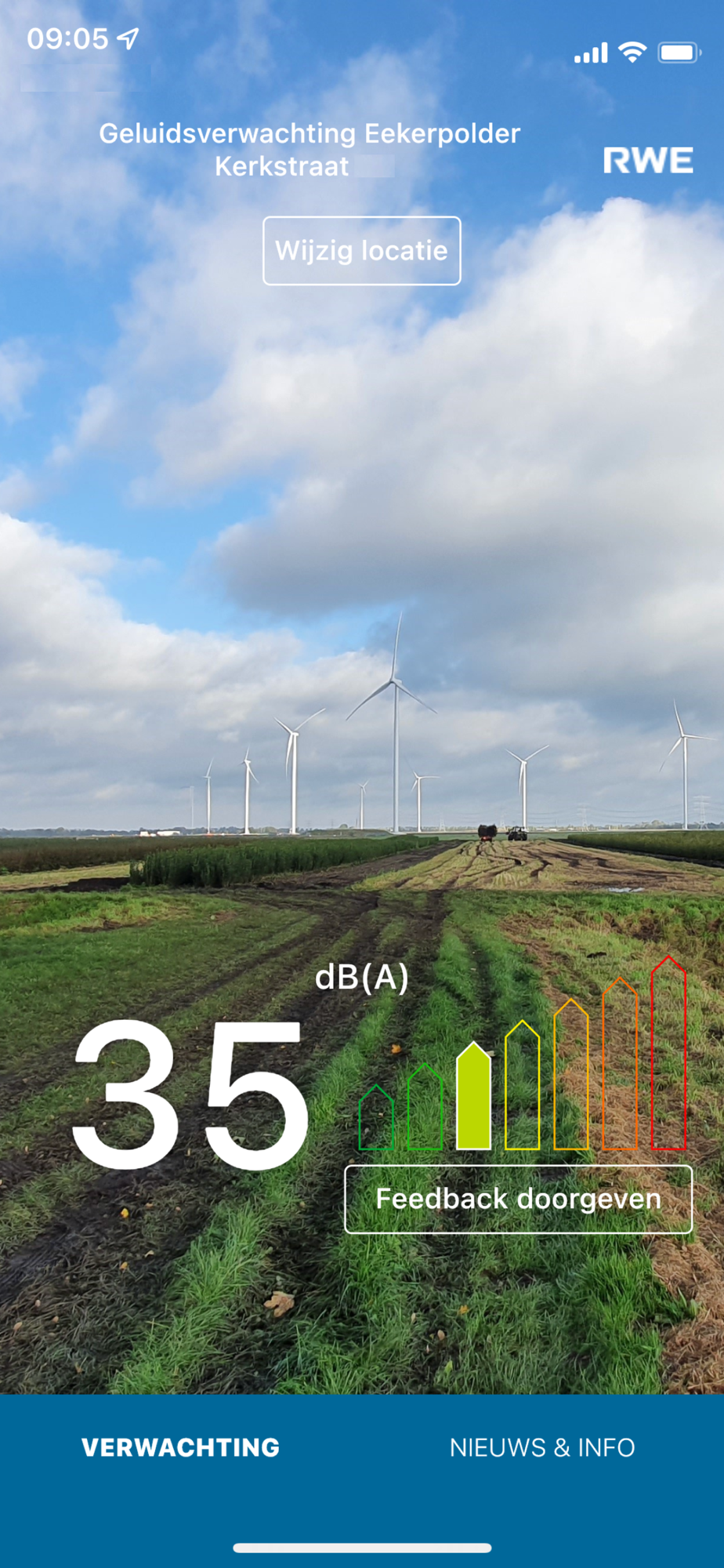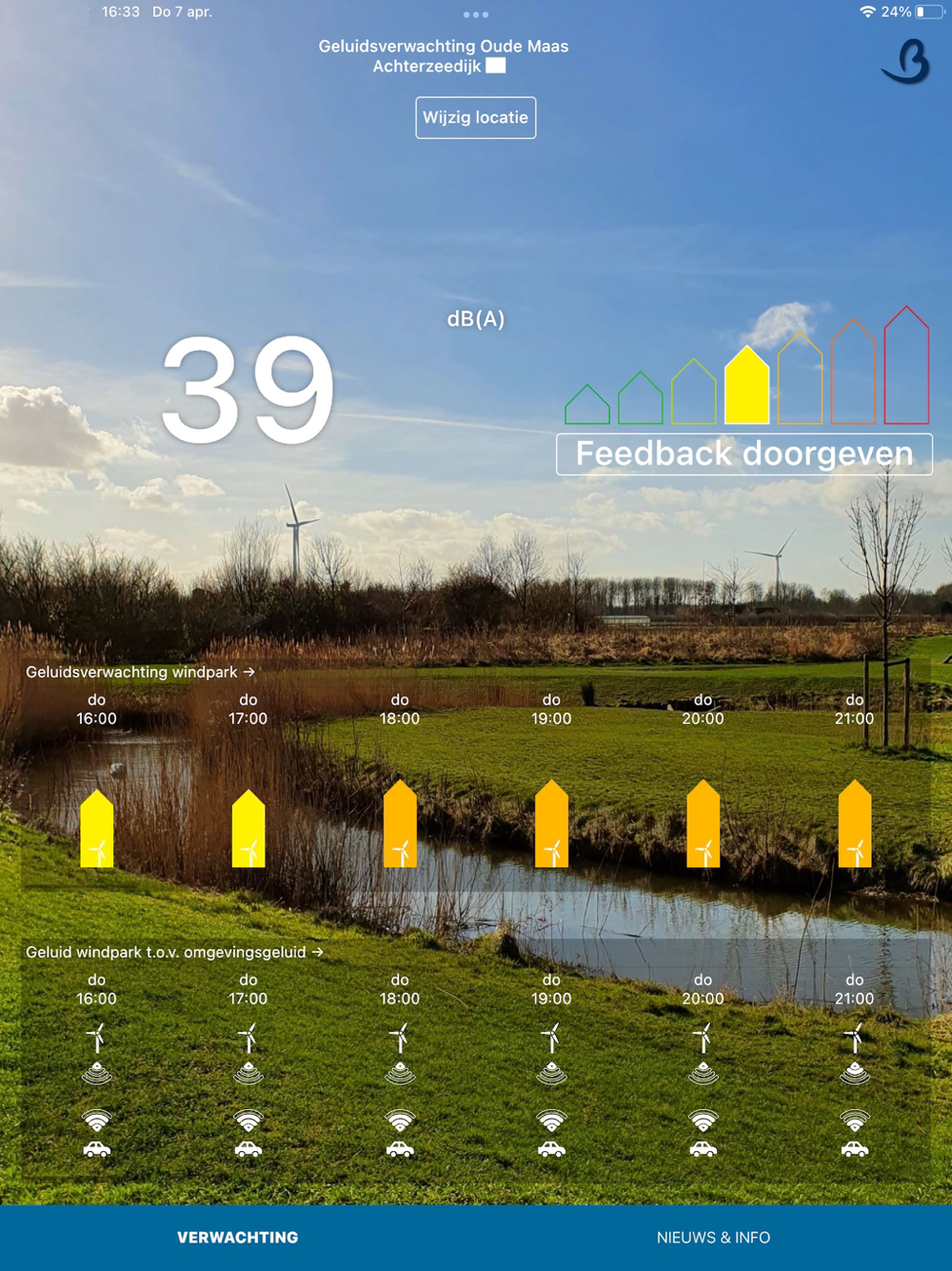 Geluidsverwachting.nl is een unieke applicatie die omwonenden van een windpark persoonlijk inzicht geeft in het te verwachten geluidsniveau van de windturbines. Ook geeft de applicatie weer hoe zich dit verhoudt tot het heersende omgevingsgeluid, de lokale weersomstandigheden en de energieopbrengst van het windpark. Daarnaast biedt de app omwonenden een laagdrempelige mogelijkheid om door te geven hoe zij persoonlijk het geluid van de windturbines beleven.