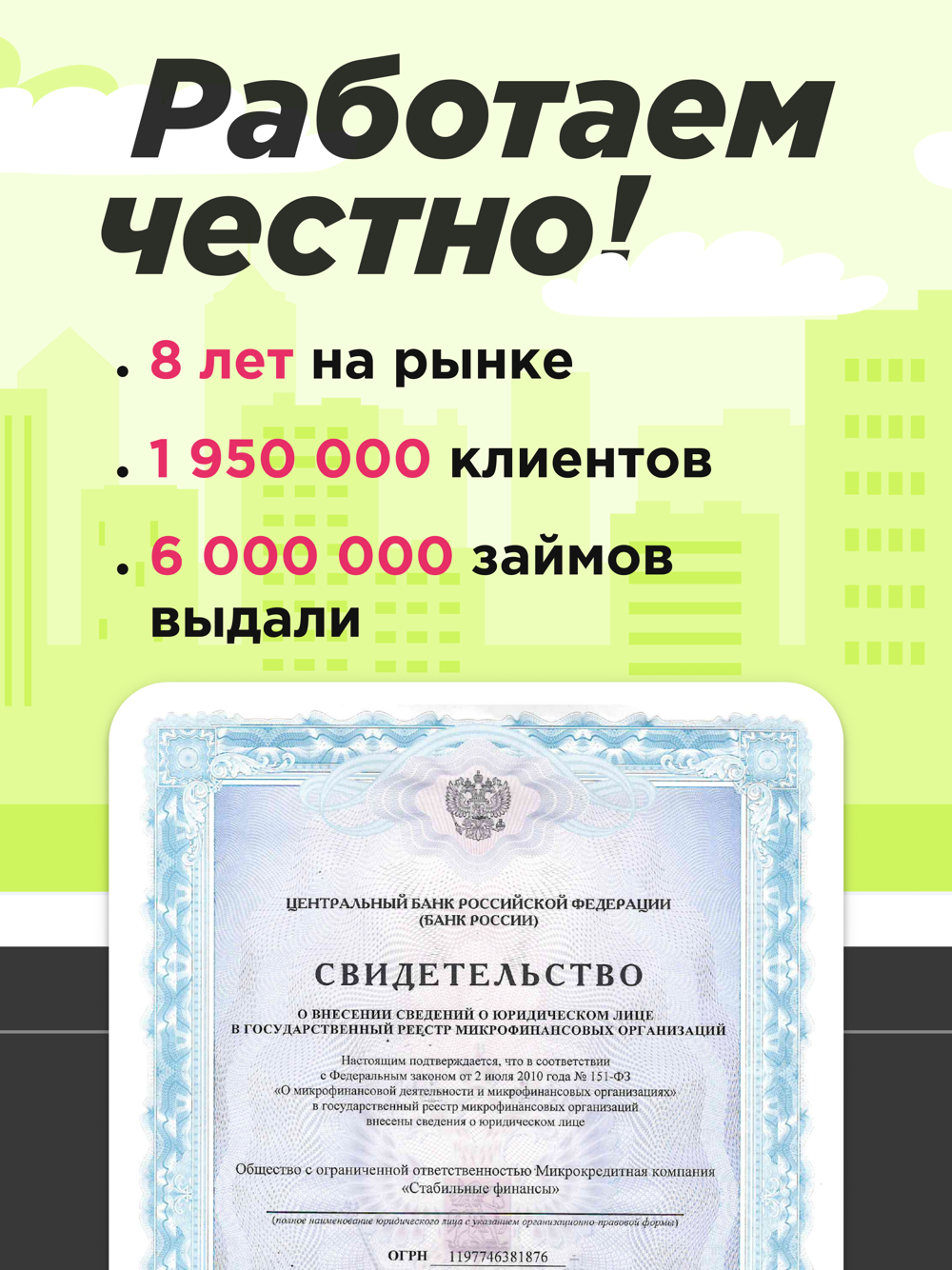 Мы работаем с 2015 года, и за это время более сотни тысяч клиентов оформили займы через наш сервис. Мы предлагаем прозрачные условия, надежность и безопасность на всех этапах.