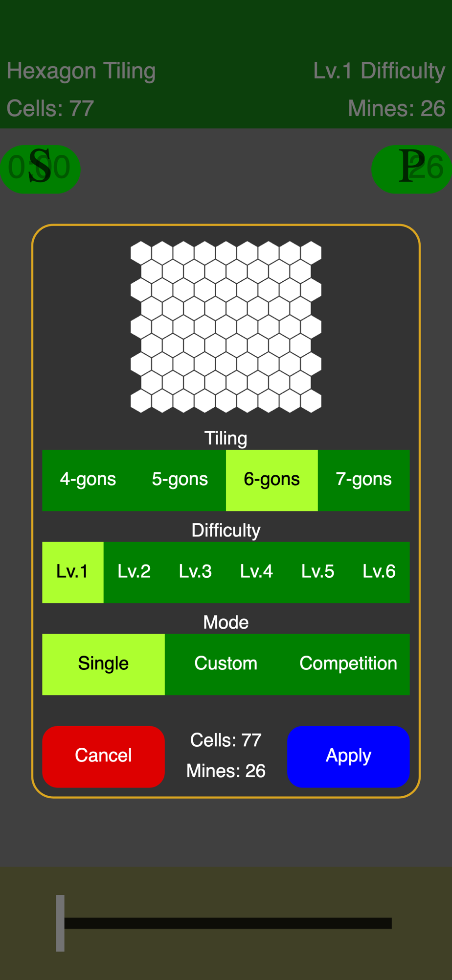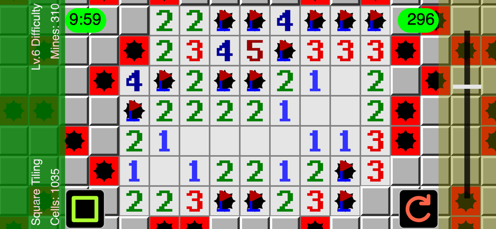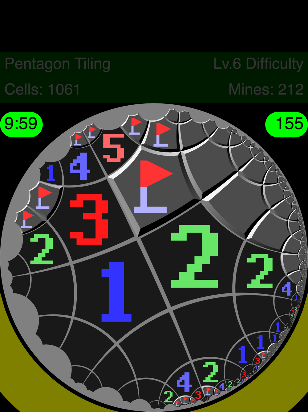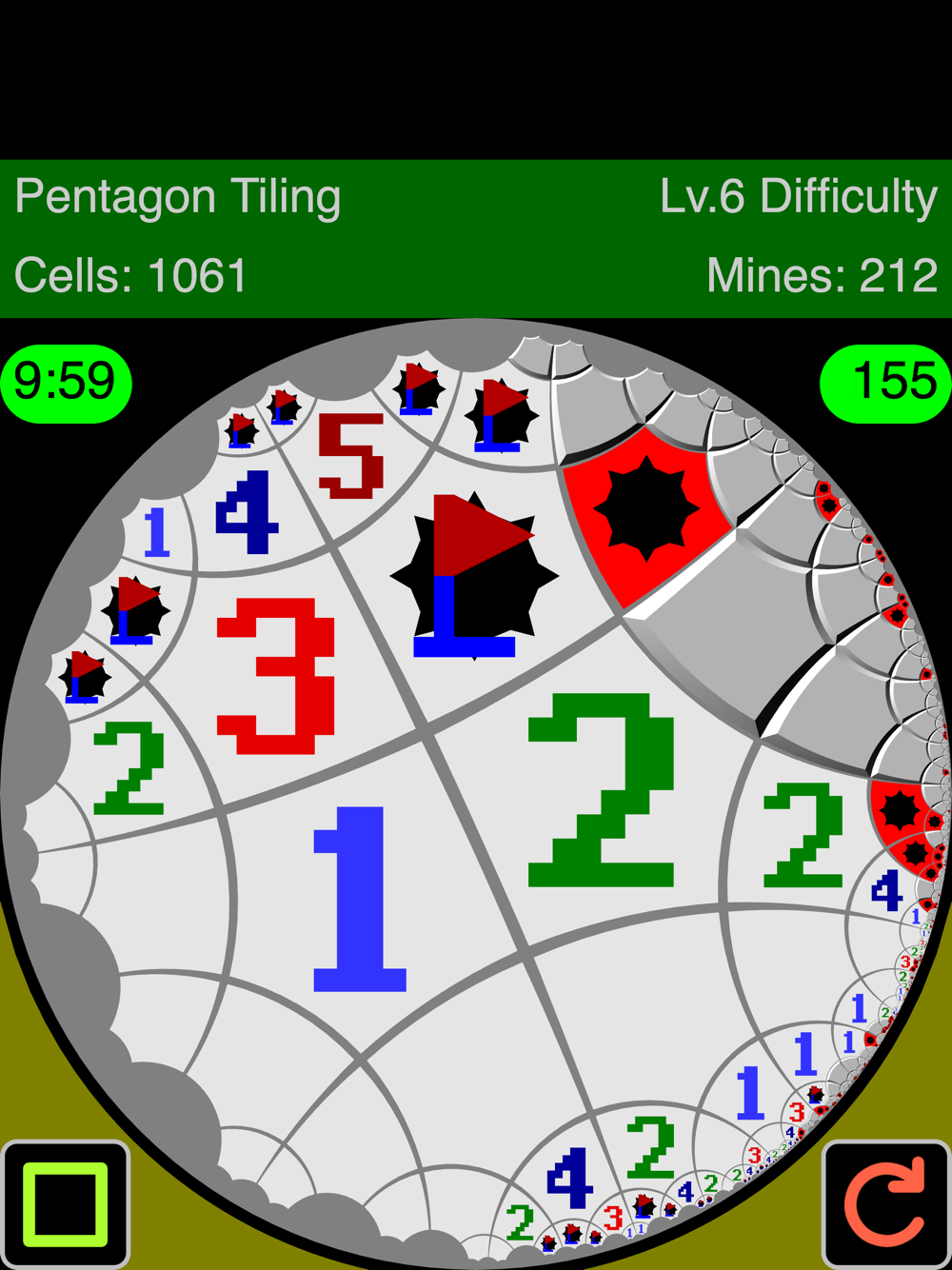 The game goal is to find out the locations of mines. Drag the circular playing field and tap cells to open them. If you open all cells that have no mine, you win. Hitting a mine by mistake, you lose the game.