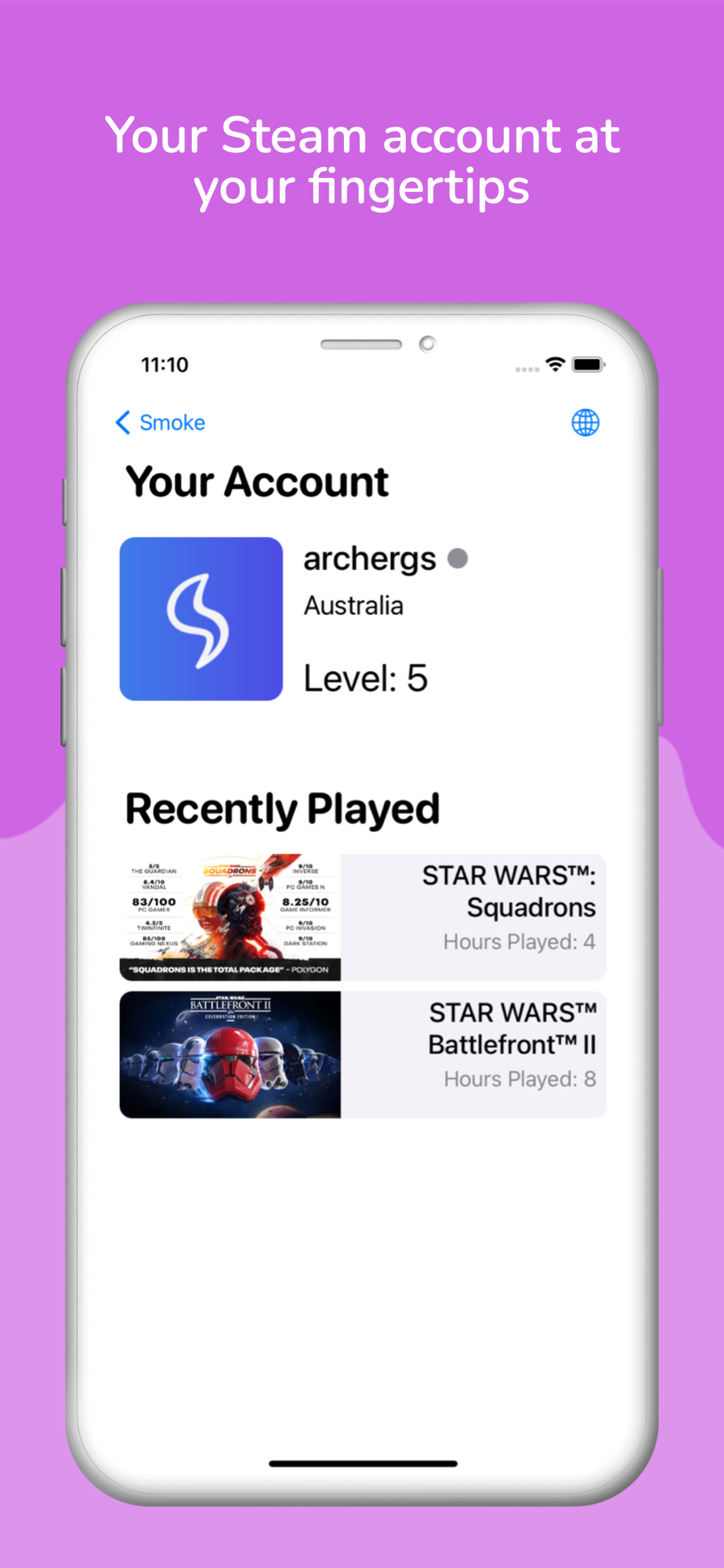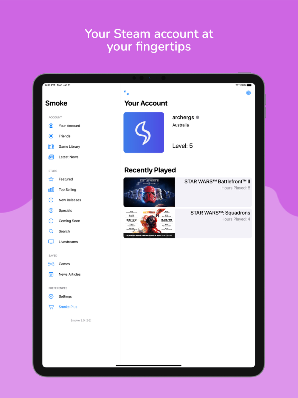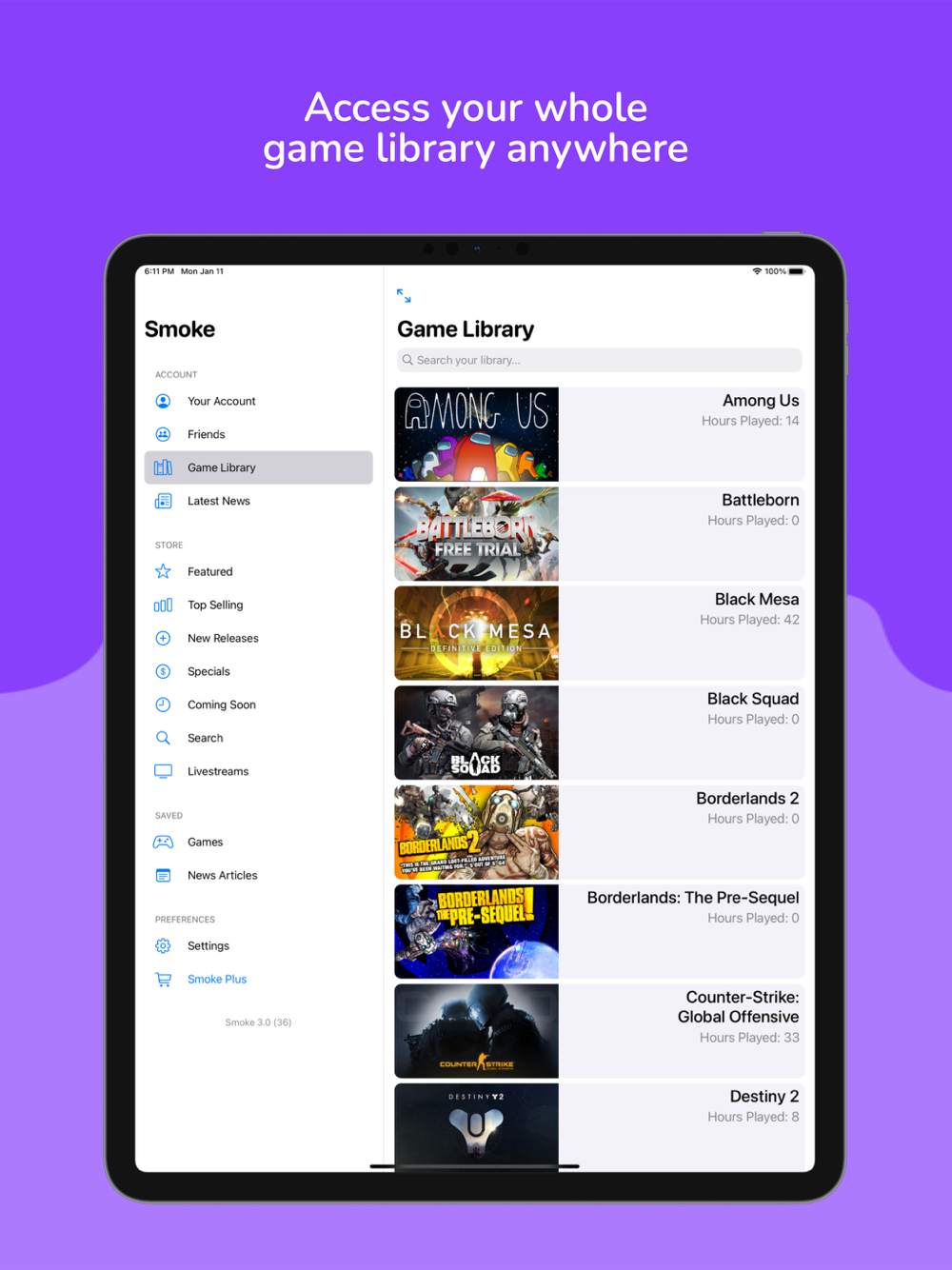 Smoke is a third-party Steam client for the Apple Watch, iPhone, iPad and Mac! With a super intuitive and simple interface, Smoke makes it easy to access all the games, news articles and live streams Steam has to offer, all in one place.
