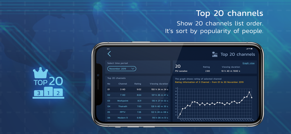 Rating Global application for viewing the rating. You can view 20 popular channels, and can view all online of the device in real-time, and can compare channels. With data display by region Via the application Rating Global