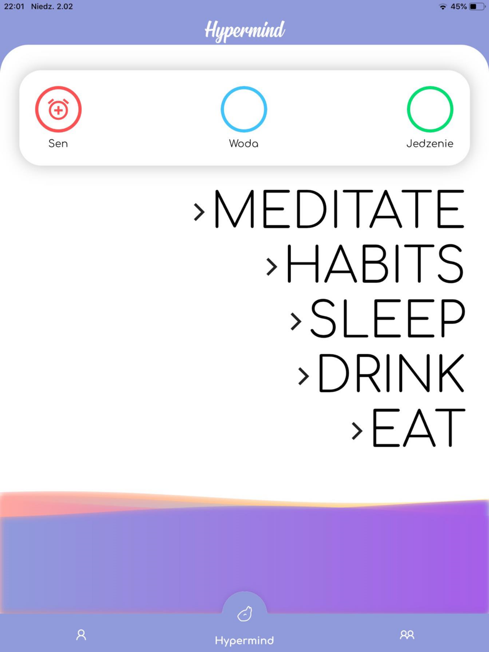People feel stressed and anxious nowadays. Today's world is very fast, people have to many tasks. We created Hypermind as a solution to this problem. The app has 5 main modules: meditate, sleep, eat, drink and habits. Each screen helps in different way. You can start meditating or listen to relaxing music in sleep module. Try best relaxing mixtape from