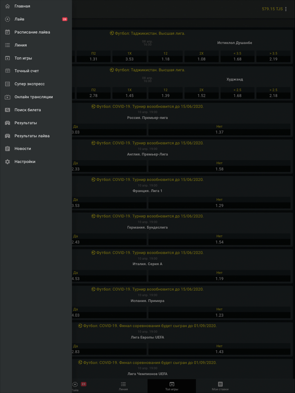 Вы можете легко и удобно делать ставки на Pre-матч и Live-события, просматривать результаты прошедших матчей, смотреть трансляции матчей, пополнять и снимать средства со своего счёта, делать ставки на супер-экспресс, экспресс-дня и многое другое.