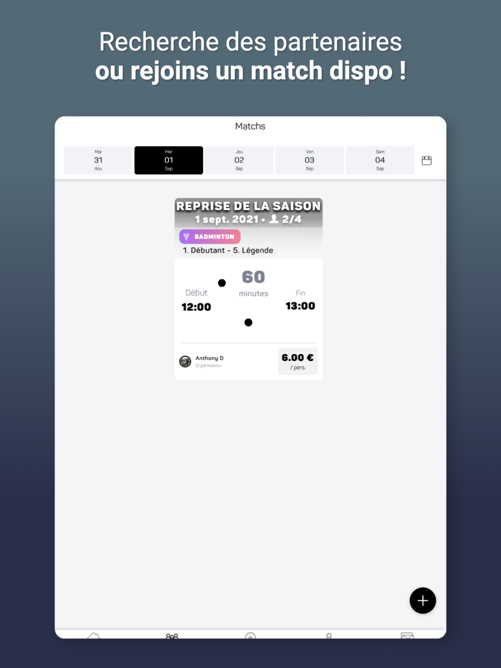 Organise tes matchs en 2 clics et rejoins une communauté de joueurs de foot et de badminton autour de toi !
