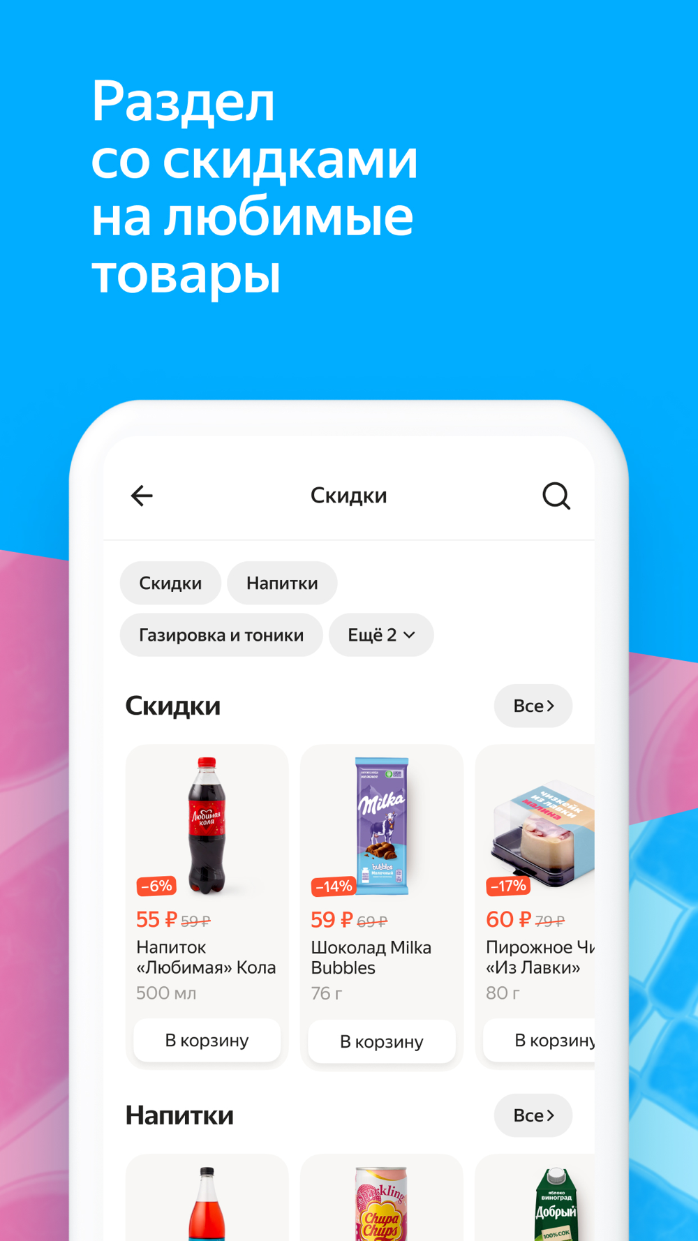 В приложении можно заказать не только нужные продукты — фрукты, крупы, молоко, — но и готовую еду как в любимом кафе, товары для детей, животных и дома. Заказывайте десерт к чаю или закупайтесь всем необходимым на неделю. Проводите больше времени с семьей, друзьями и домашними питомцами.