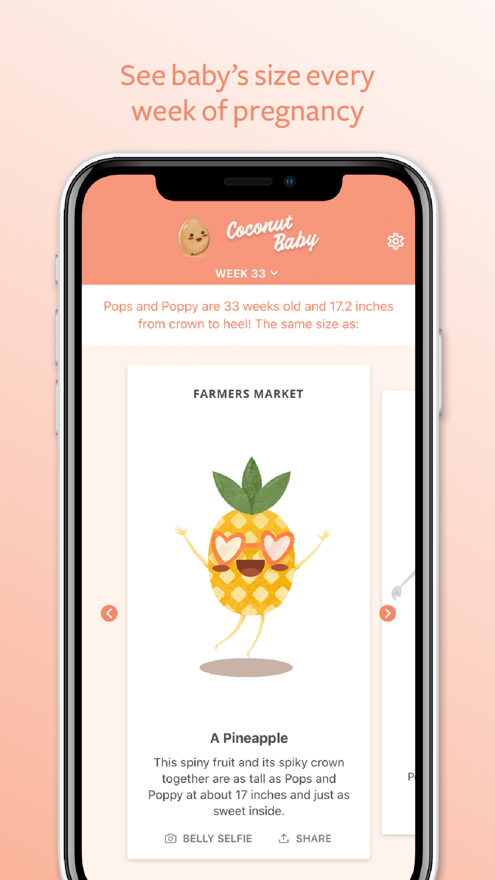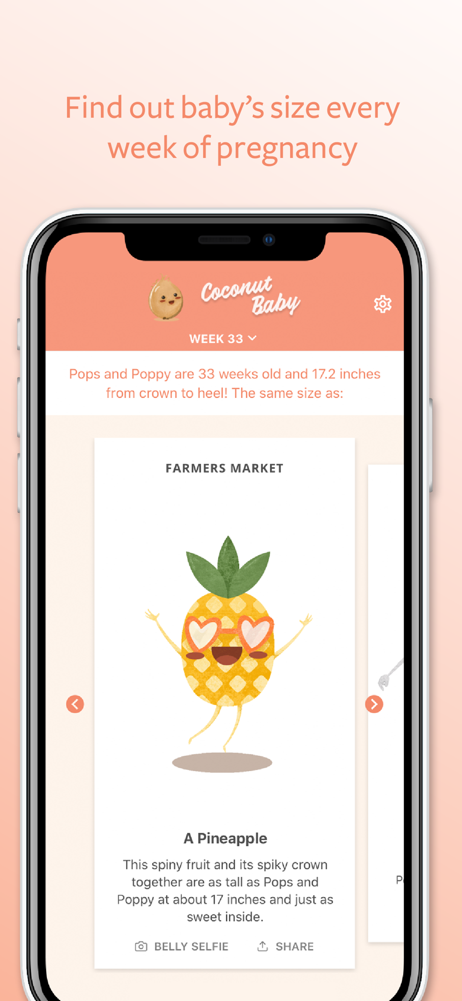 - Share your growing baby’s size with friends and family each week