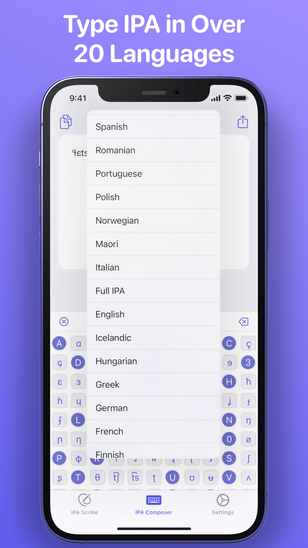Audio file transcription - Import audio files directly from the Voice Memos or Files app and instantly transcribe the speech in the recording to IPA.