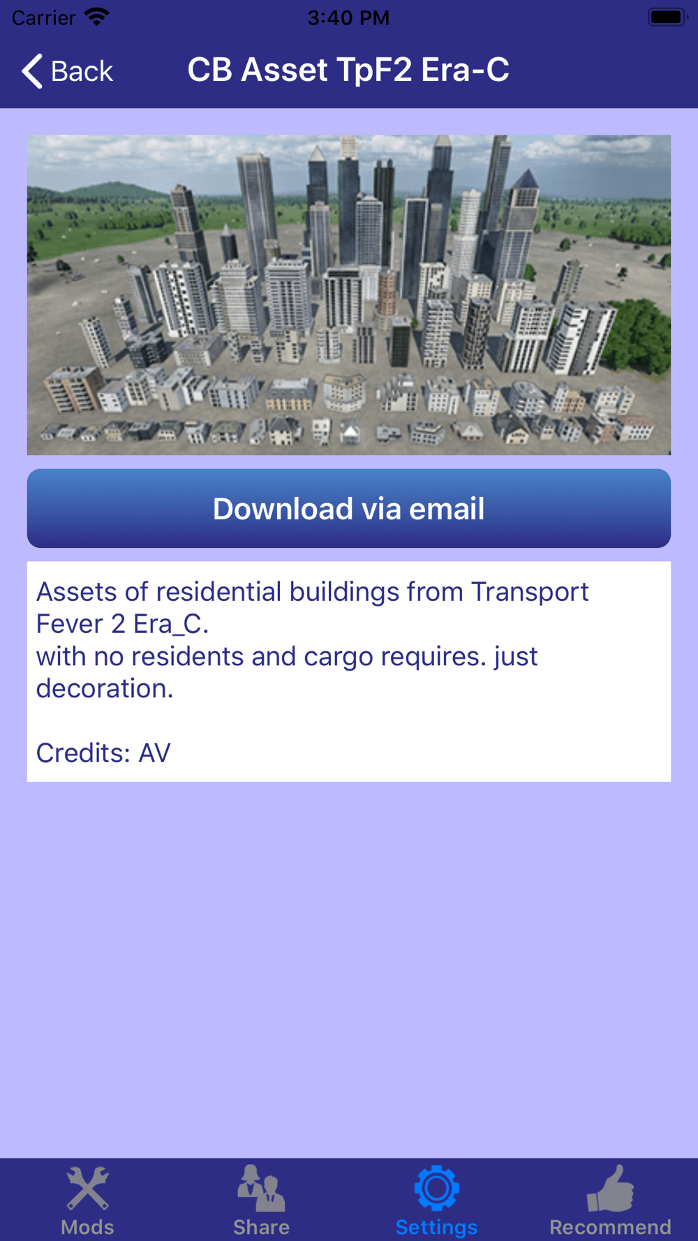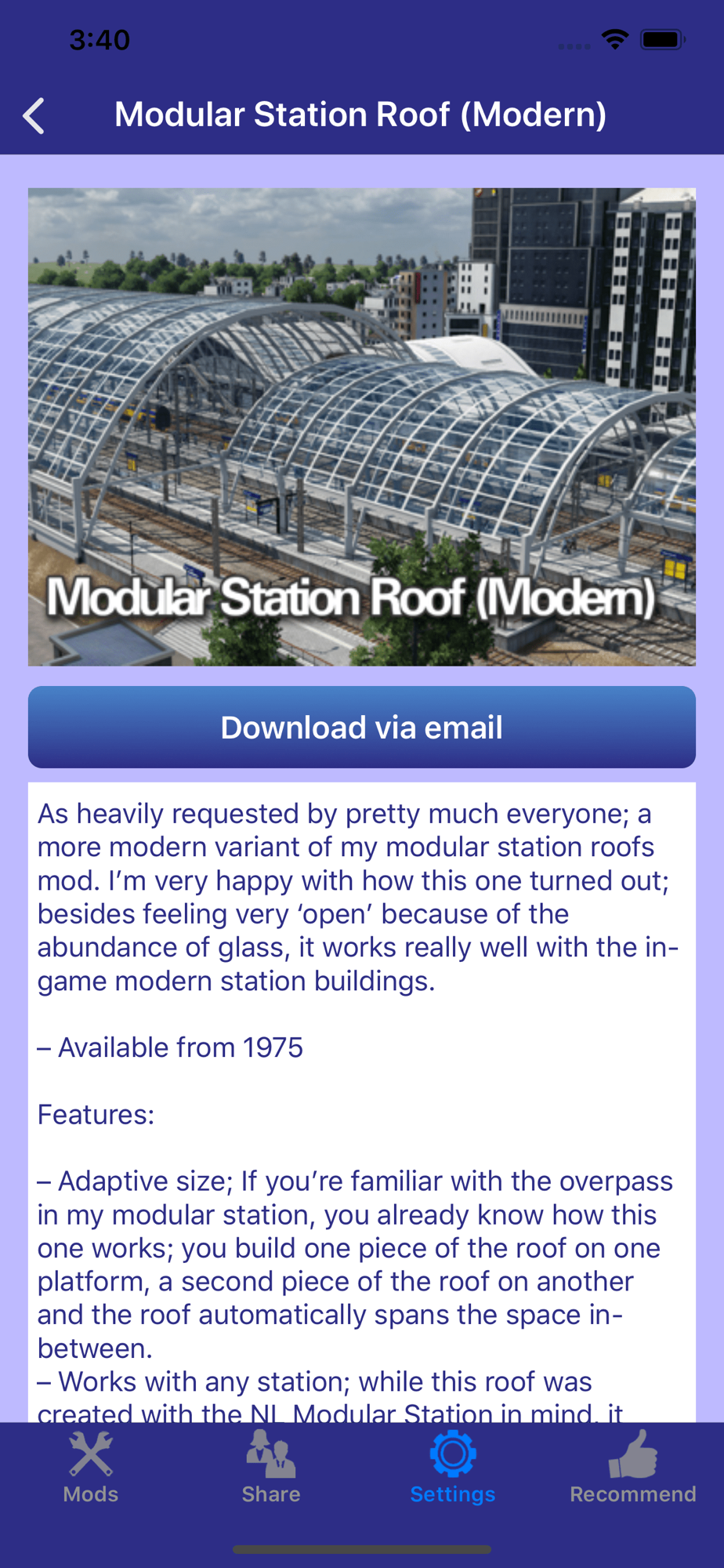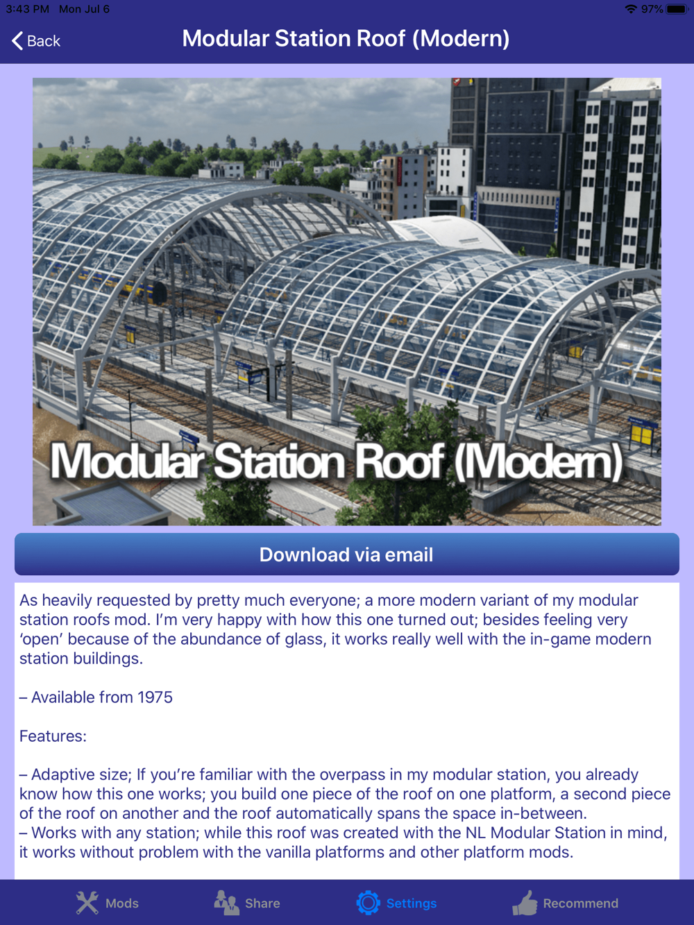 This app contains Mods of Transport Fever 2, all the mods can be downloaded from our server without further charge or periodic subscription. With the mods screenshots and descriptions, you will be able to find out whether the time and money needed is worth to backup the game, download and install the mods.