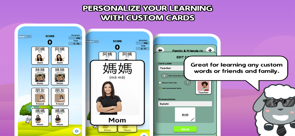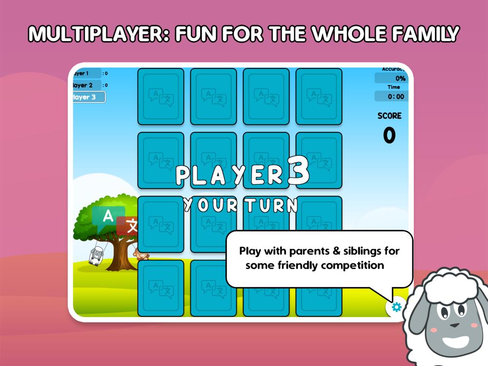 All of the features within the game are customizable including whether you wish to learn Japanese, Spanish, Simplified Chinese or Traditional Chinese. You can choose whether you want to show pronunciations, English definitions or not. Use our recommended settings or customize the experience for you and your child.