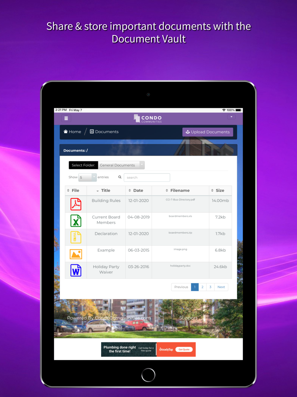 CondoCommunities.com enables users to upload building documents, by-laws and board minutes for residents. Residents can submit service requests and incident reports online. The service request module tracks request records and all communication until requests are resolved.