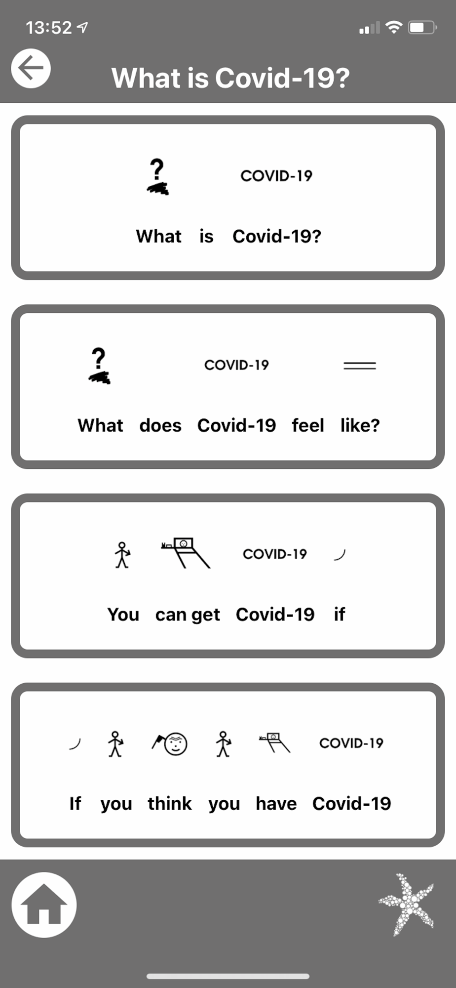 In the general guidelines content, the app uses simple cartoons, videos, voice and Makaton symbols to convey information in an easy-to-understand format.