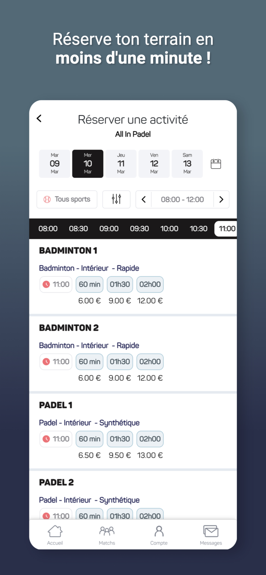 Fini la corvée de réservation ! Avec l'application tu n'as plus qu'à accéder aux créneaux disponibles et à en choisir un. Le club recevra alors automatiquement ta réservation.