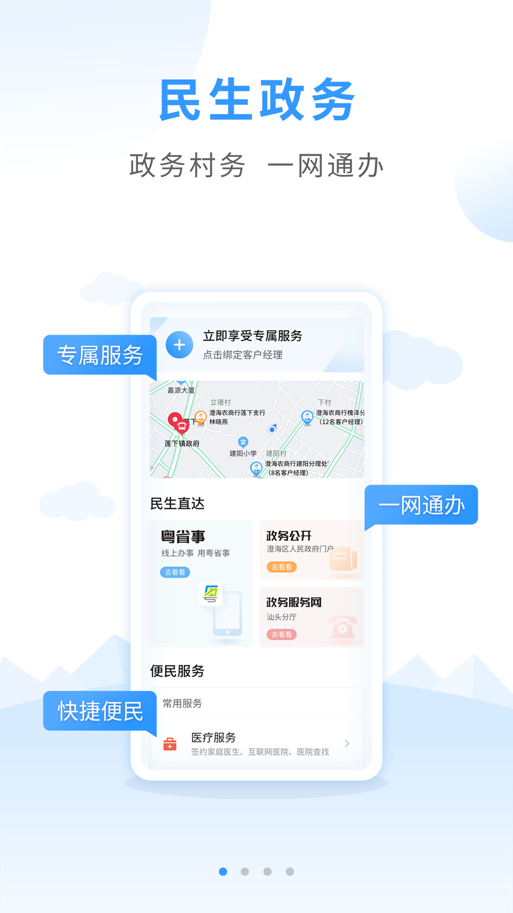 广东农村普惠金融户户通是服务于乡村振兴的线上、线下普惠金融合作平台,通过链接乡村、链接产业、链接政府,为广东本地老百姓提供便民的政务服务、普惠的金融服务,打通普惠金融服务的“最后一米”,全心全意为每个村民、个体经营者和中小微企业提供线上化服务,包括便民政务服务、信息发布、一对一普惠金融服务、产品销售和购买等,用数字化的手段共促乡村振兴,共建乡村美好生活。