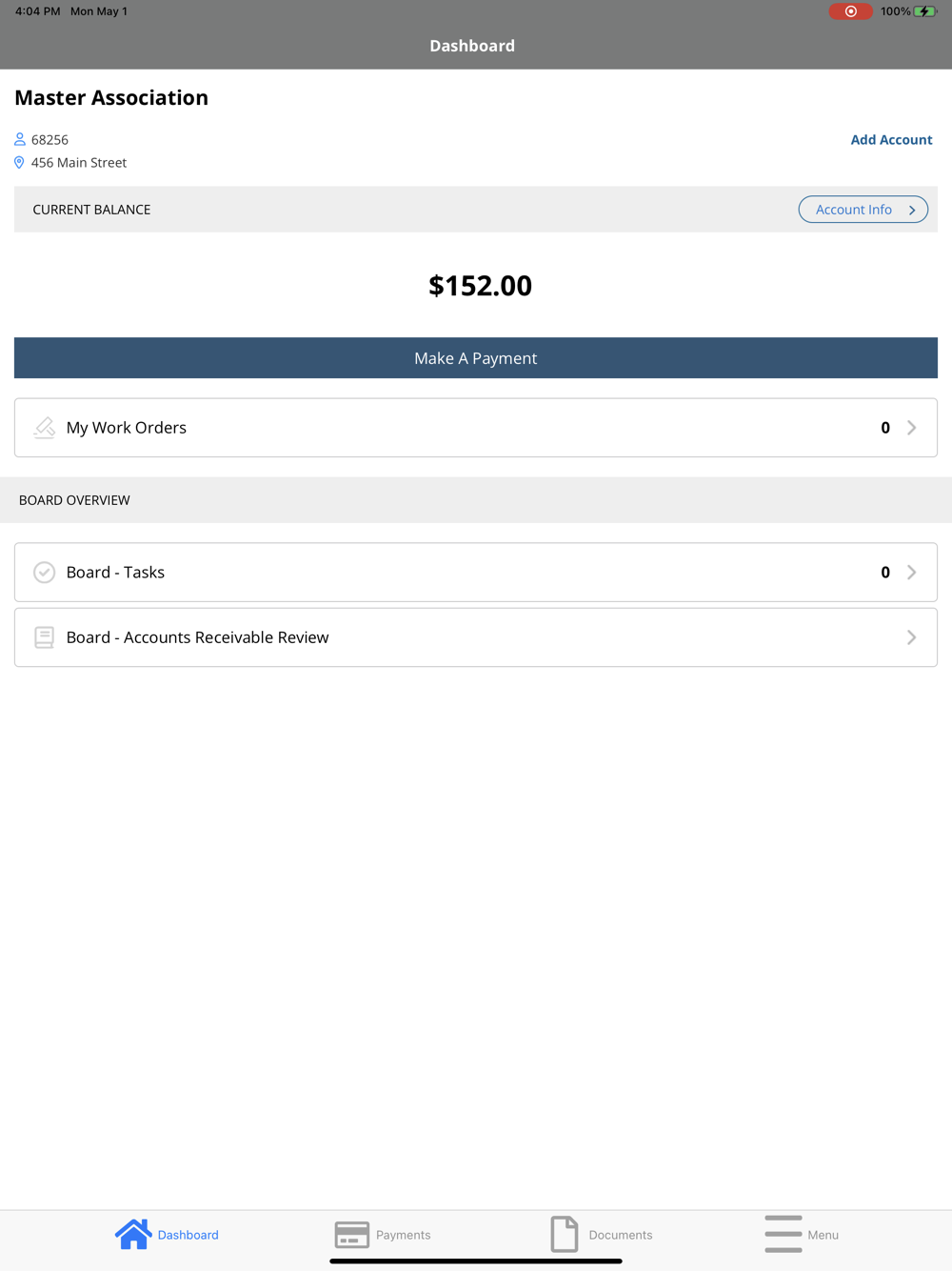 If you do not have a login, download the app and then, you can register for the portal. When registering, please make sure to spell out your street name. For example, use Road instead of Rd. or Court instead of Ct., etc. Once verified, an initial password will be sent to the email address you provided. Please allow one full business day for our Customer Service Team to verify your registration. If you belong to more than one association or own multiple units, click on “Switch Account” on the top right of the dashboard page and then click “Add Account.”
