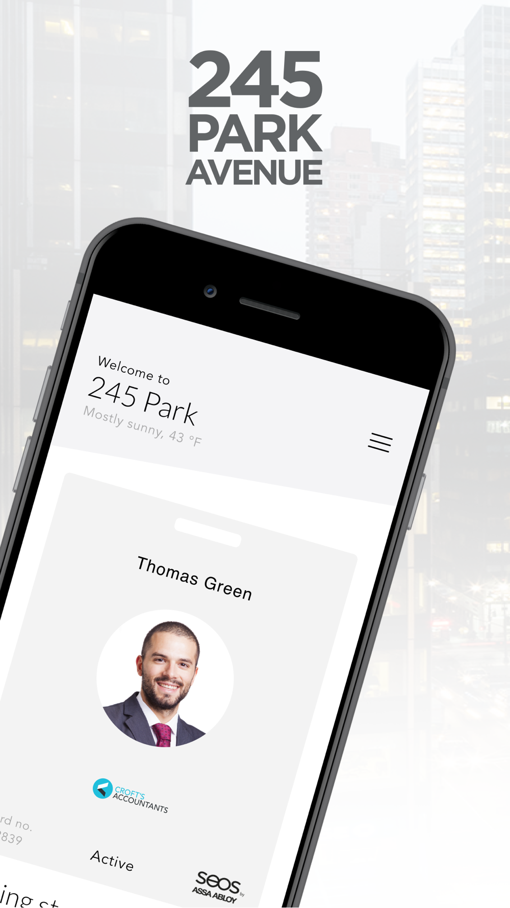 This application is intended for employees that work in 245 Park Avenue and their visitors. Important information about the building can be found on the dashboard, which dynamically changes throughout the day. The app allows employees frictionless access into the property and will enable them to invite guests to the property as well. Additional modules are available including, amenity reservations, events, community information, etc.
