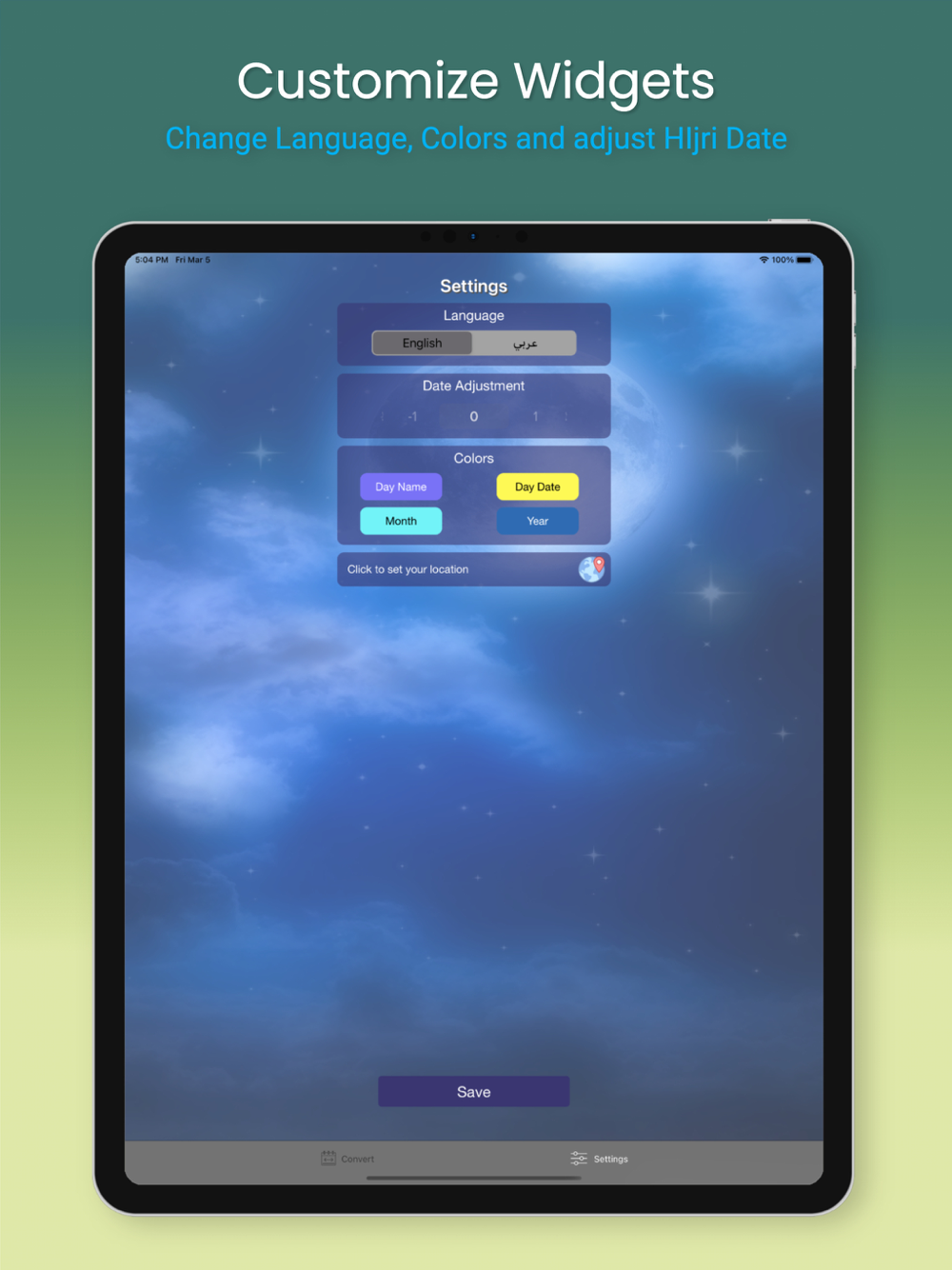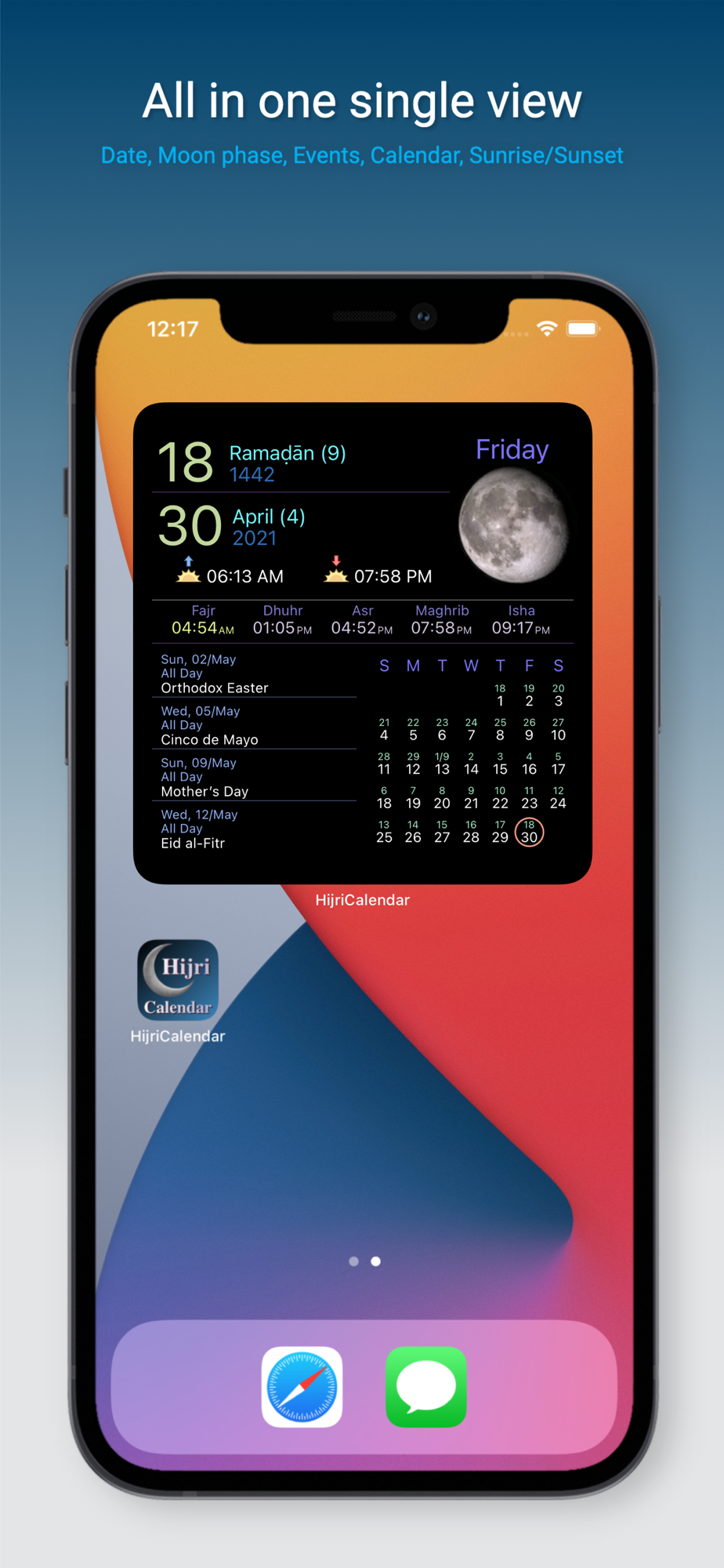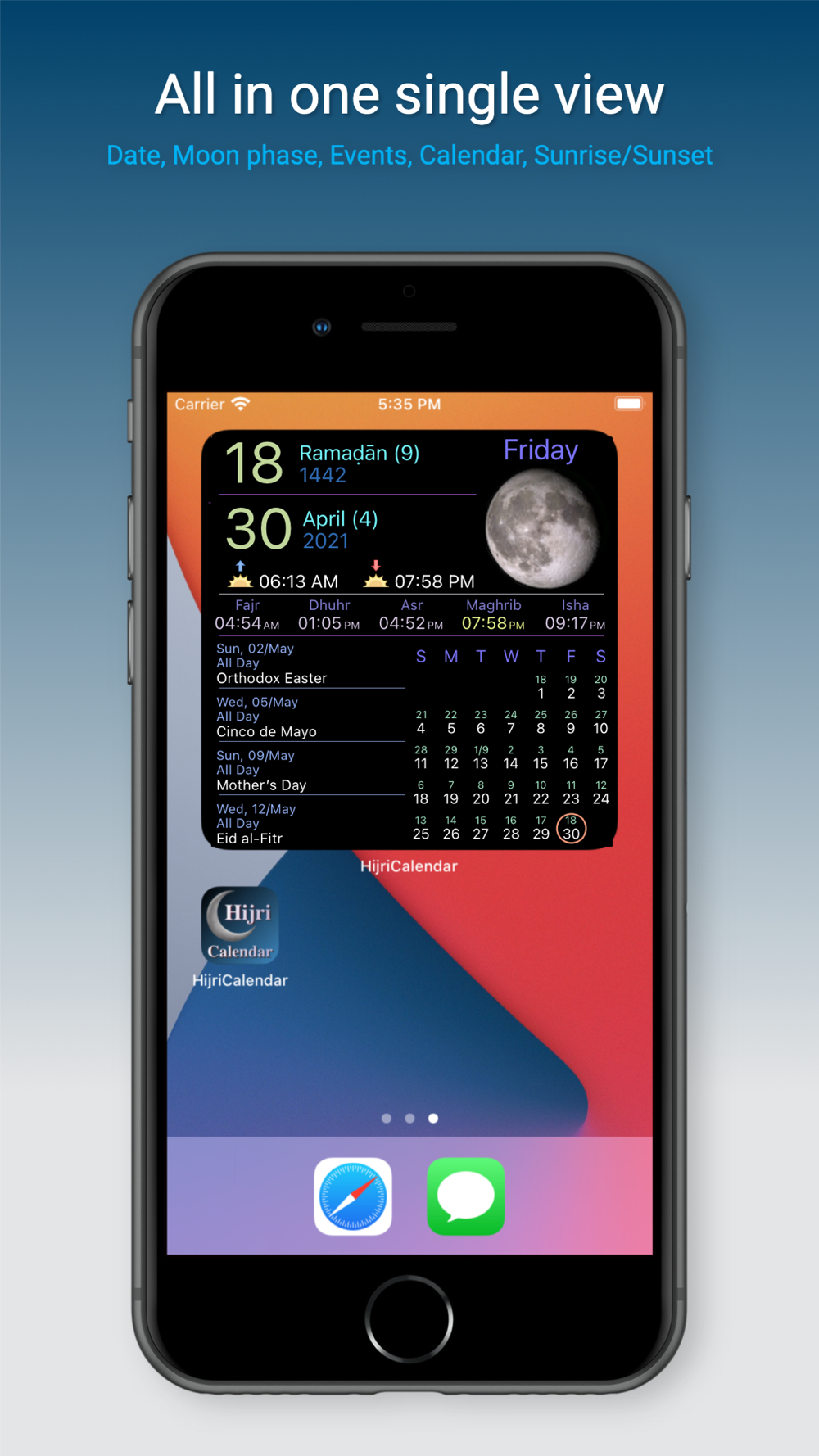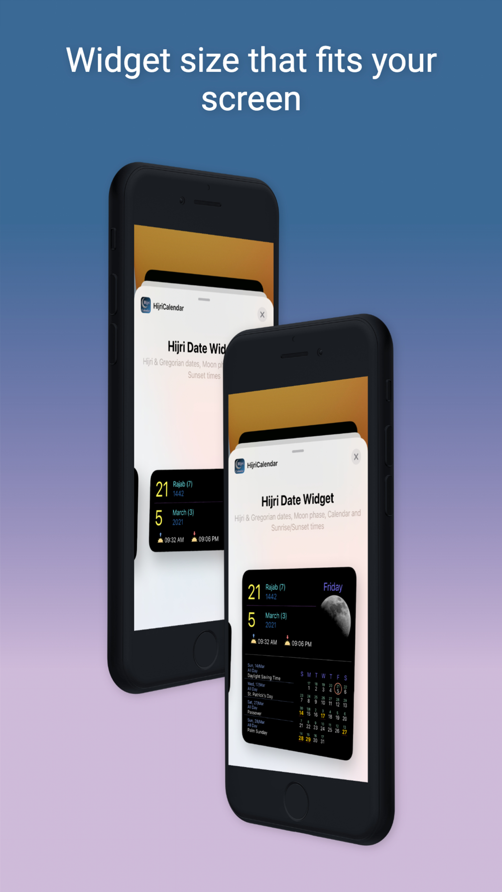 Great widgets that show Hijri & Gregorian dates, Prayer times, Sunrise/Sunset times, Moon phases, and Calendar events.