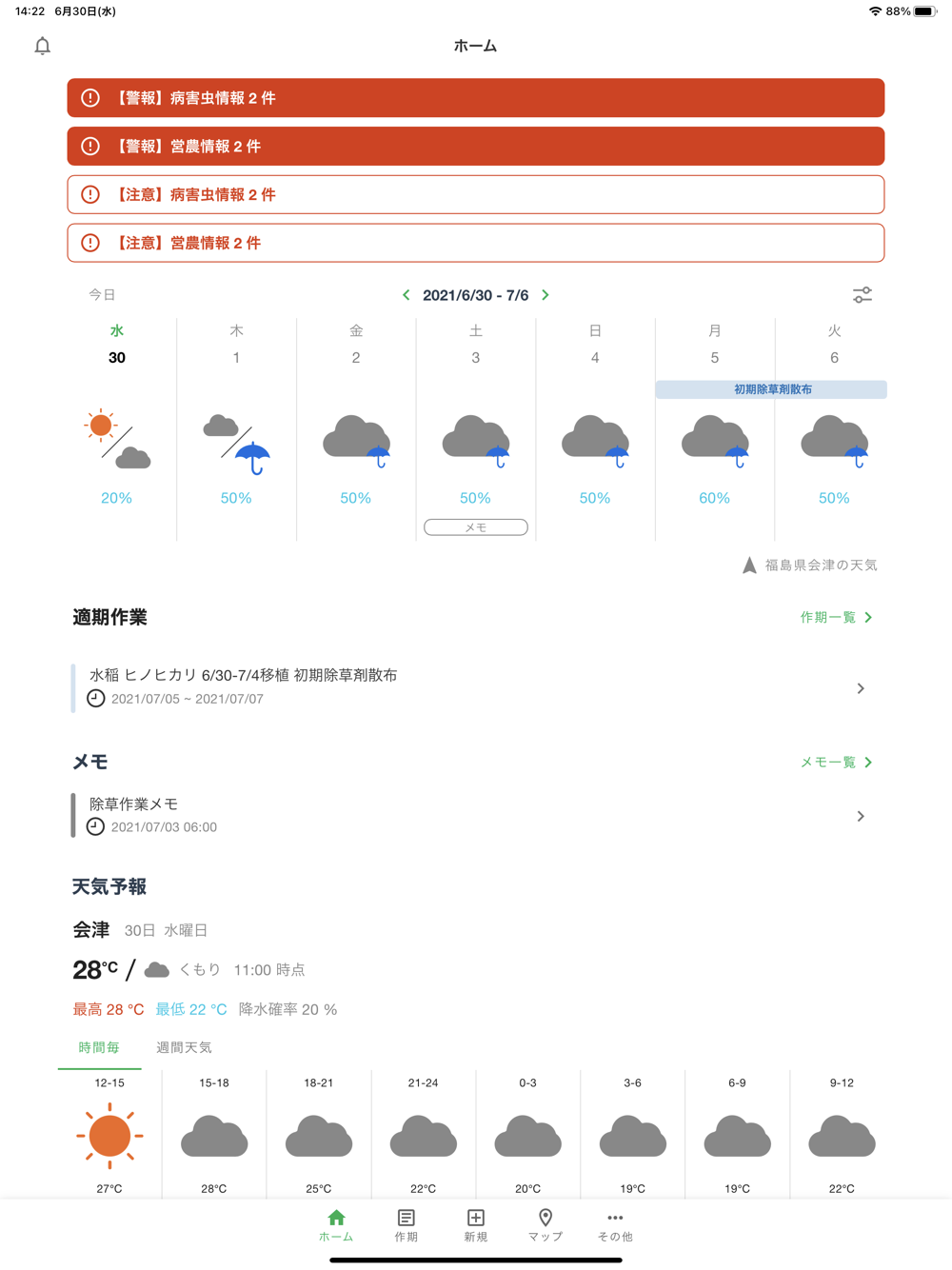気象アラートや病害虫発生アラート、栽培管理アラート(高温障害、冷害)、水位アラートなど、日々の環境に合わせたアラートを受け取ることができます。