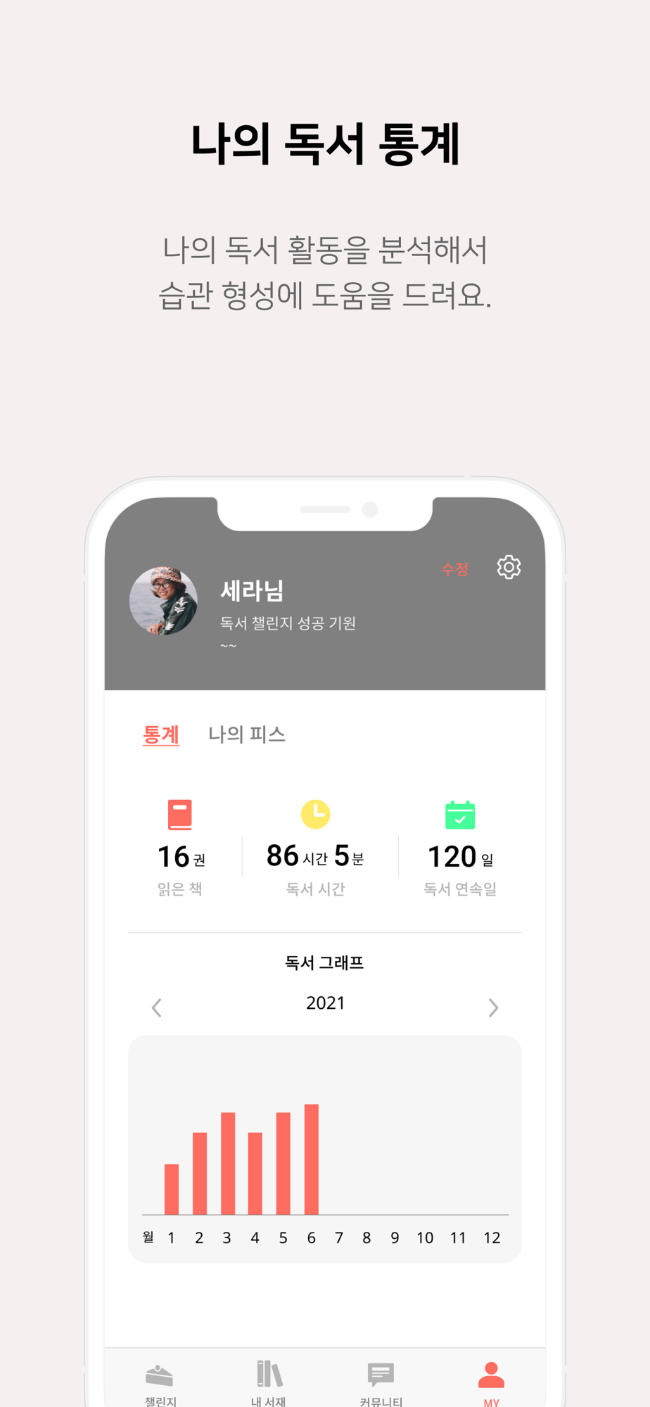 - MY 탭에서 독서 통계와 획득한 케이크 리워드를 볼 수 있습니다.