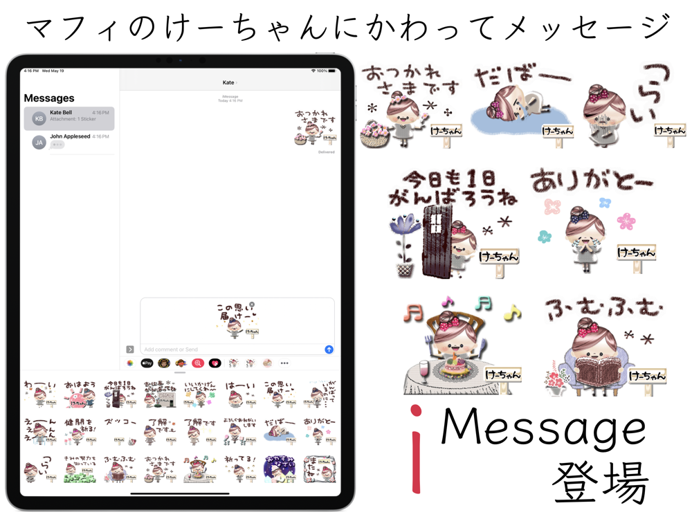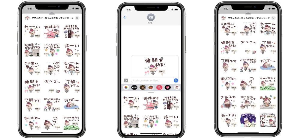 ラインのお名前スタンプマフィ〜にかわってメッセージでお馴染みの FaaIndustryです。マフィのけーちゃんにかわってメッセージiMessageステッカー初登場!こちらは静止画ステッカーになります。全国のけーちゃんへ。けーちゃんへのプレゼントにもどうぞ。created by Faa Industry