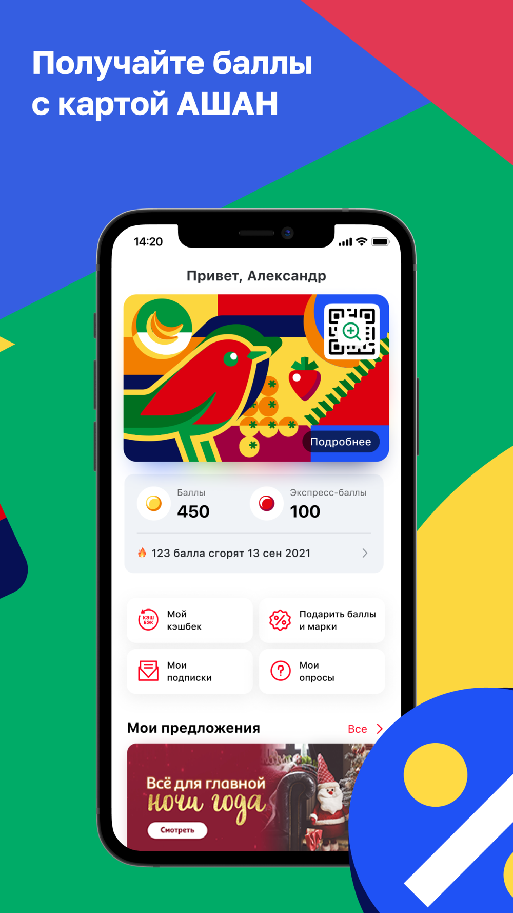 - В мобильном приложении Мой АШАН есть QR-код для начисления и списания баллов