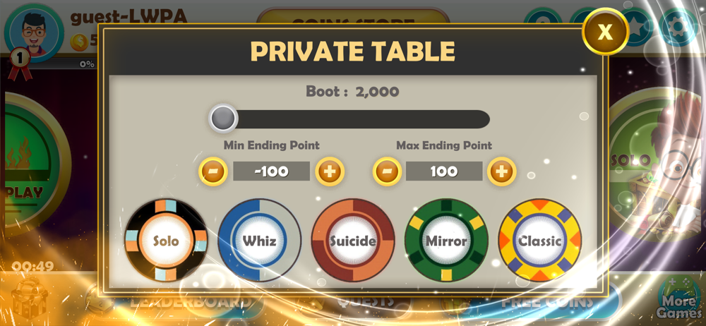 spades offers you a great experience against Great AI. You can play in many different game modes such as Classic, Solo, Mirror, and Whiz in spades.