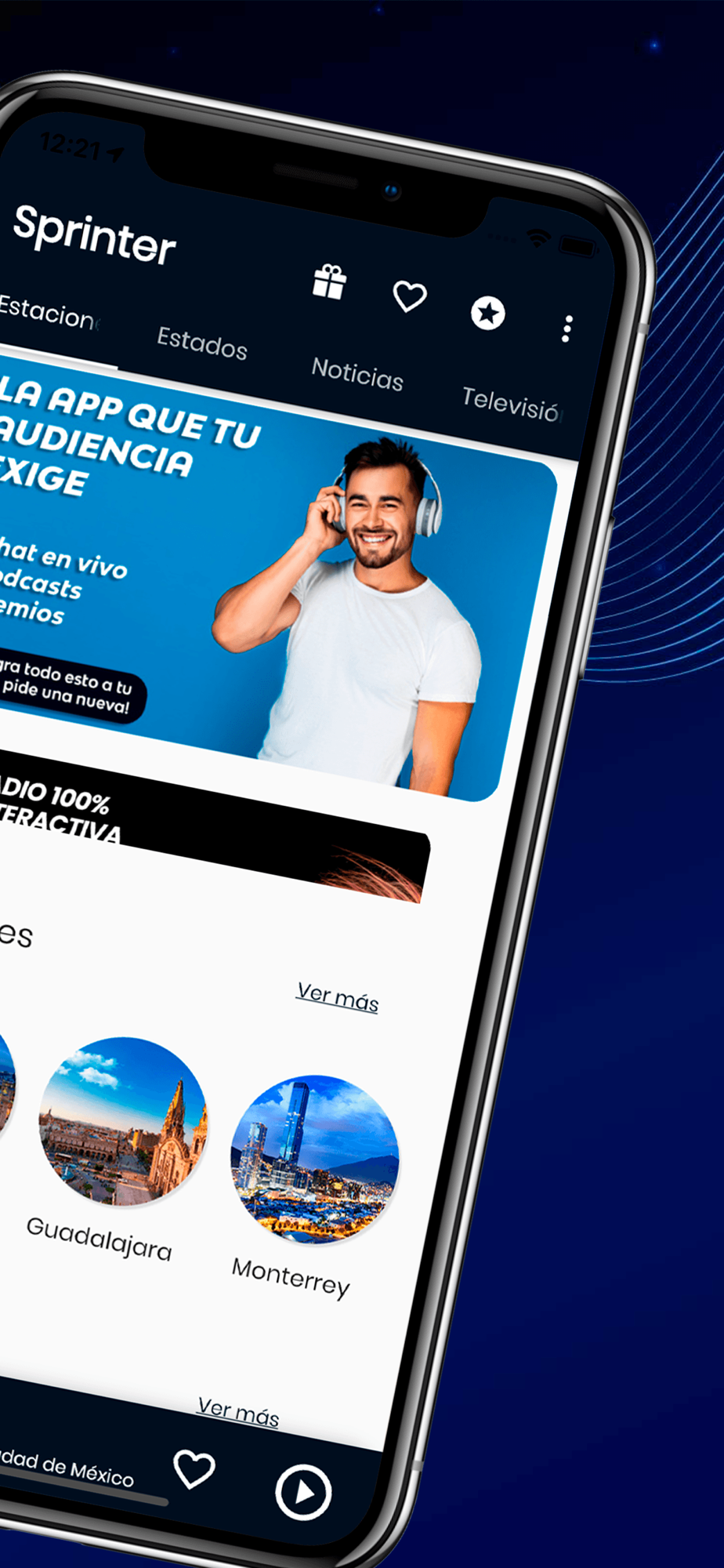 No basta con reproducir streaming, Sprinter es una aplicación totalmente dinámica. Feed de Noticias, player moderno y de fácil uso, Chat en tiempo real con cabina, múltiples estaciones de múltiples ciudades, notificaciones inteligentes, redes sociales, eventos por ciudad, juegos, podcast, top musicales, clima y muchas más características. Una app de radio 100% interactiva y única en su tipo.