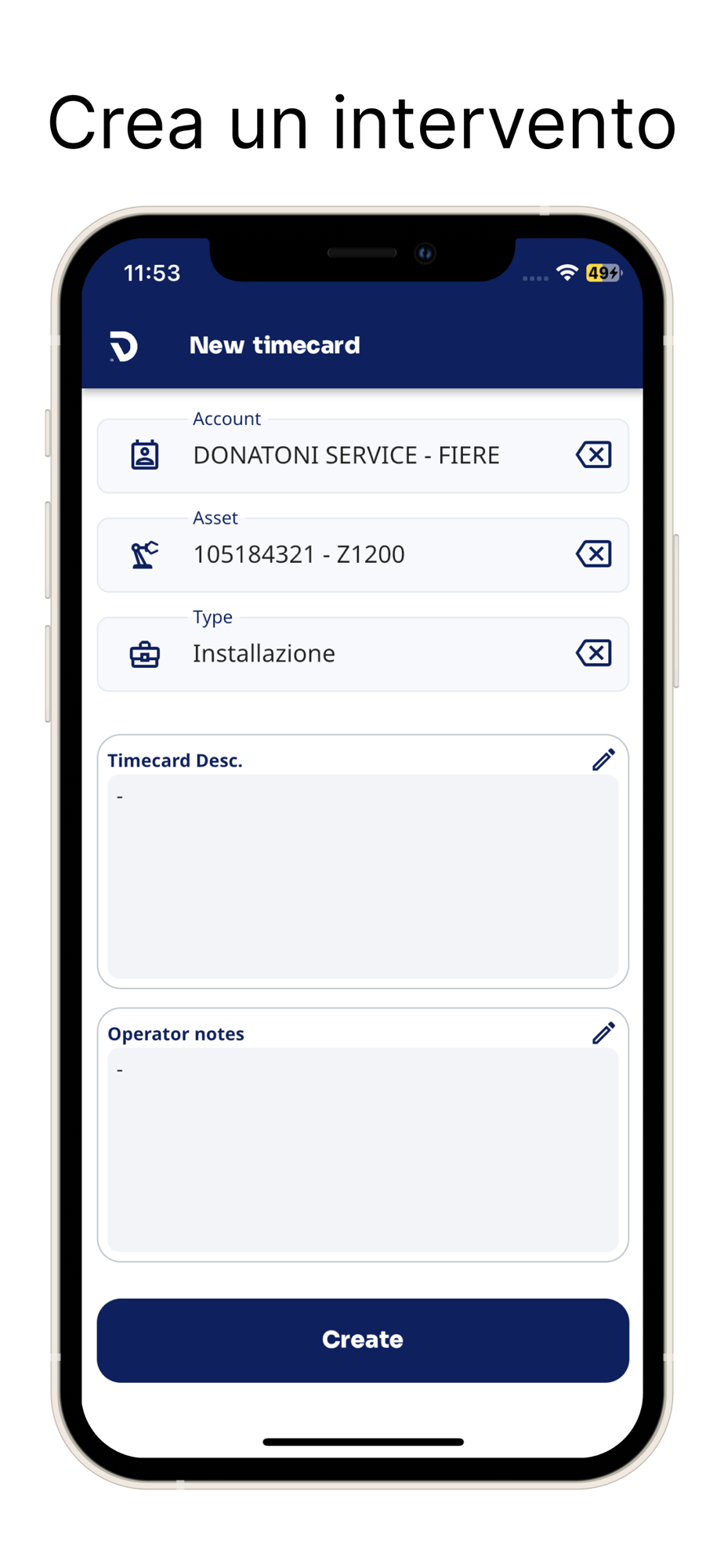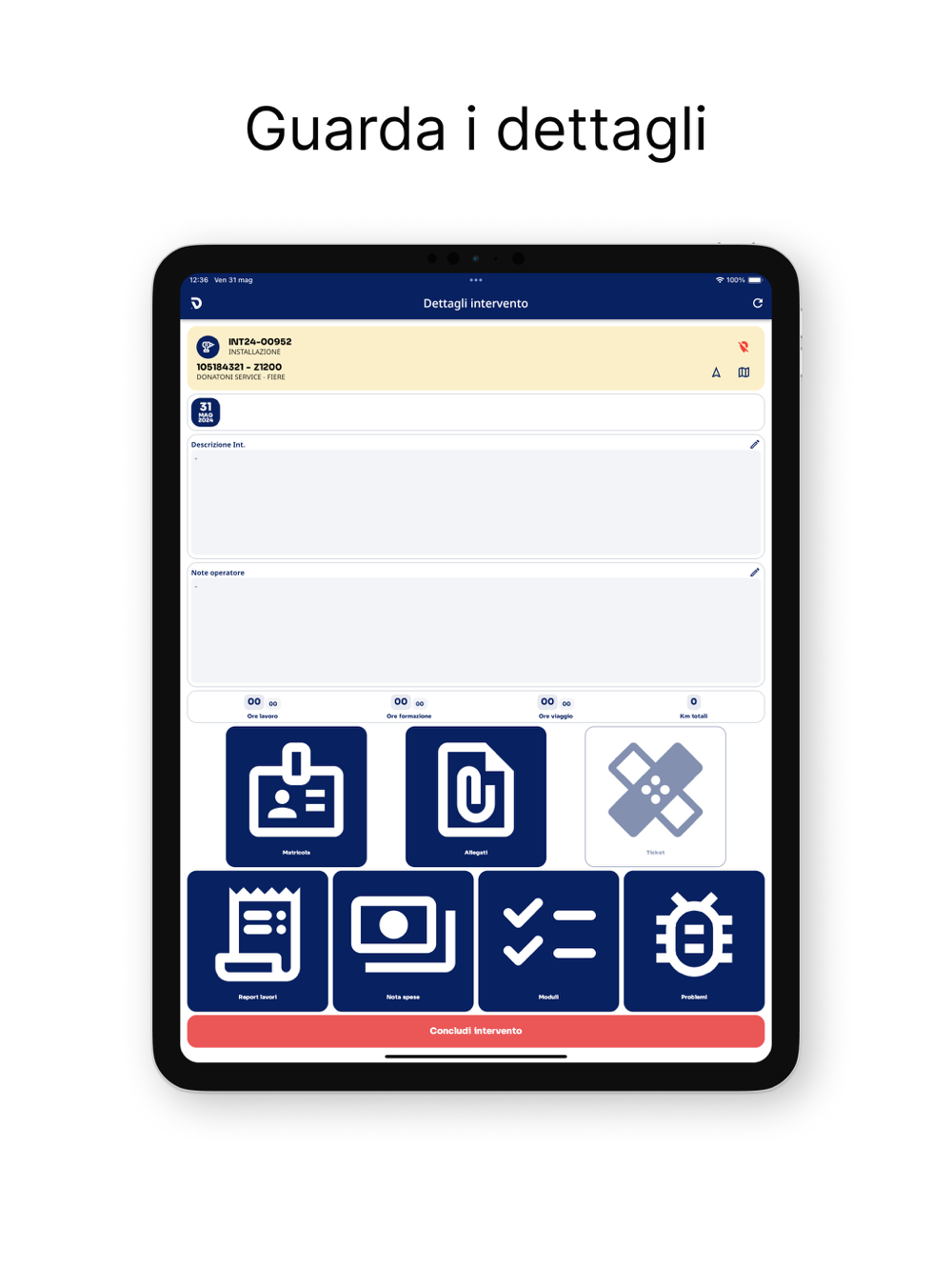 Possibilità di creare e chiudere un intervento con tutti i suoi elementi come report, spese e problemi.