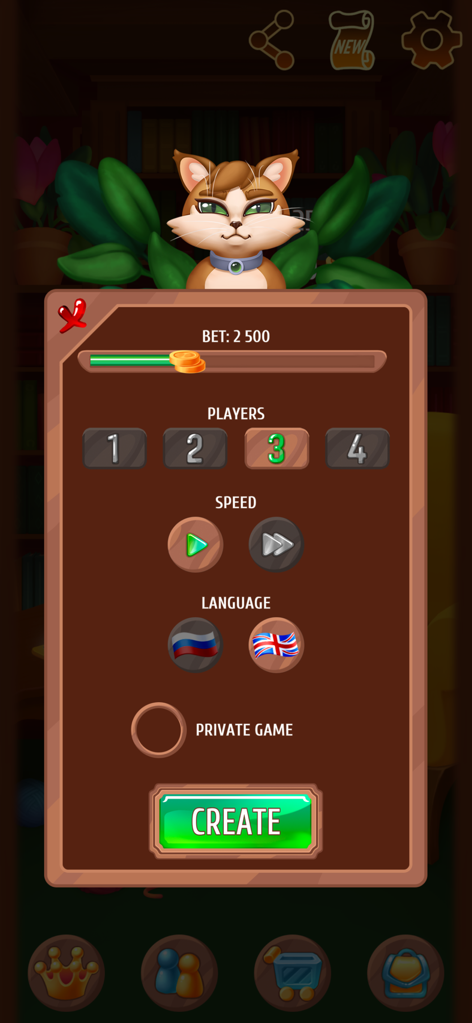 Create password games, invite friends and play together. When creating a game without a password, any player who is in the online game can join you to play the fool. If you want to play with friends, then create a game with a password and invite them to it. If you want not only to play with your friends, but also to let other people in to fill all the empty spaces, then just open the game by clicking on the button.