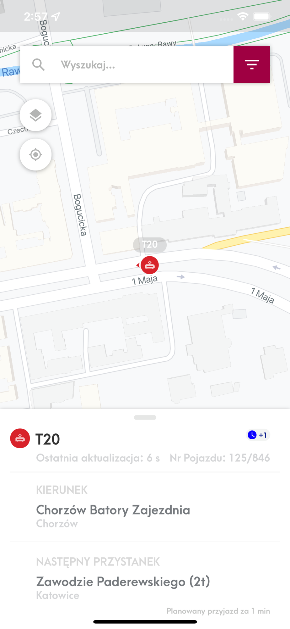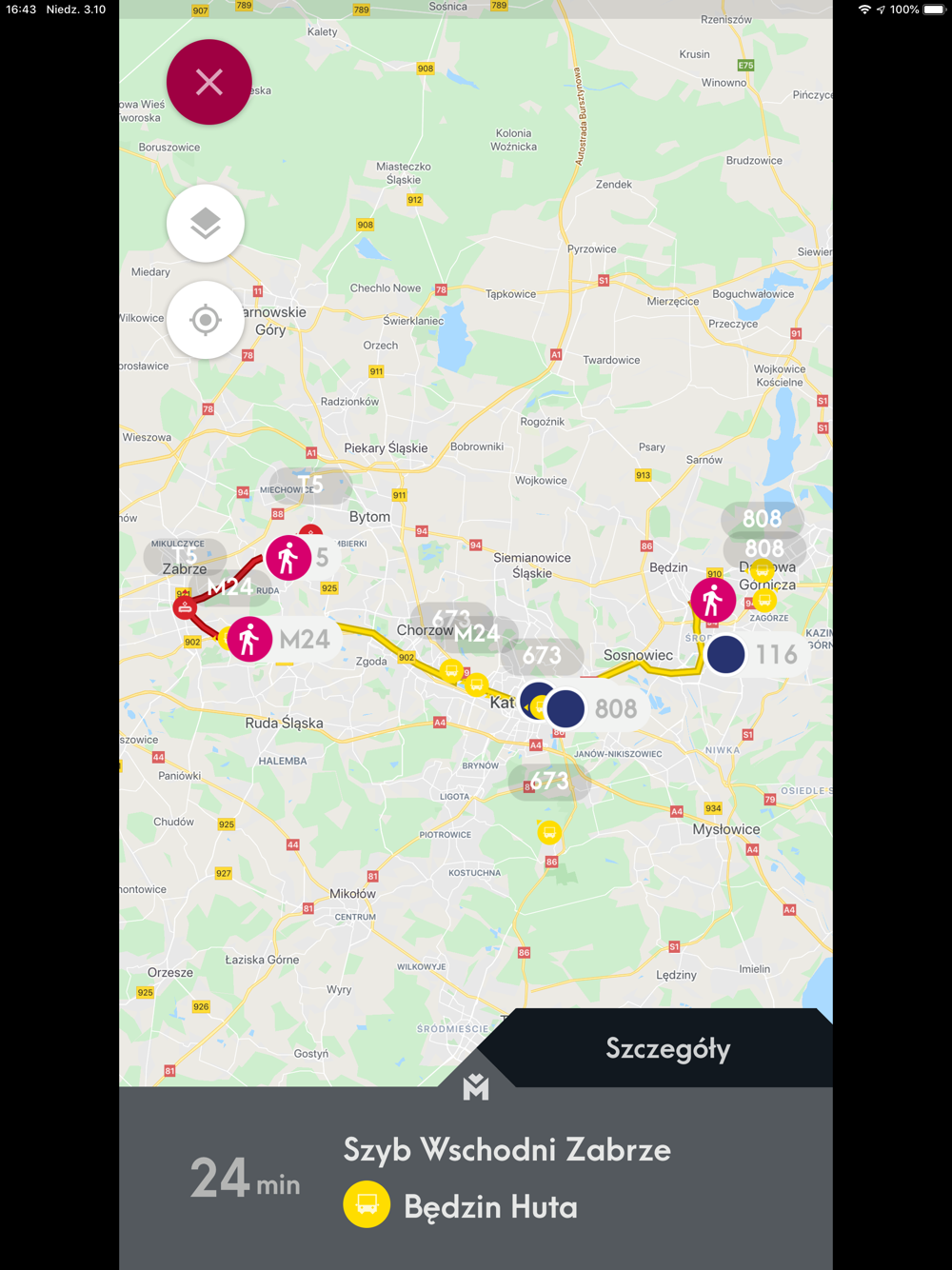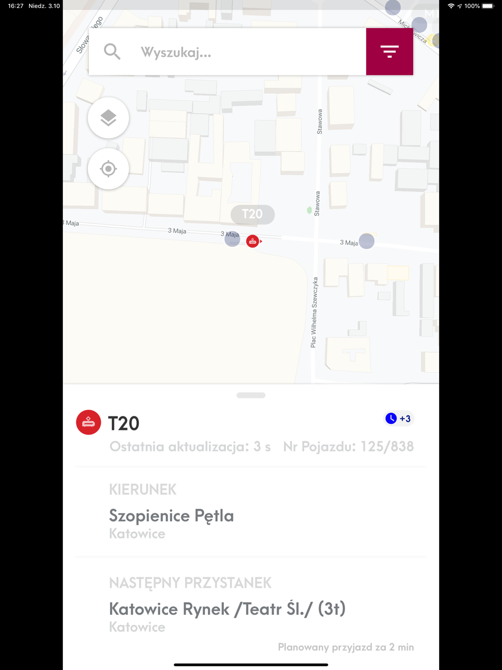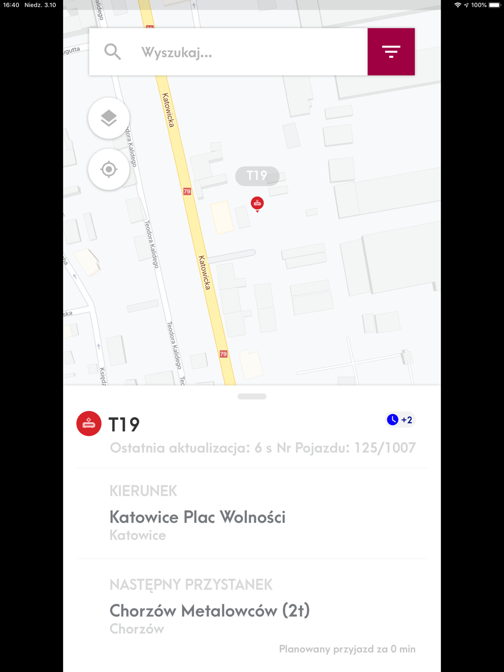 W aplikacji prezentowana jest również bieżąca lokalizacja wszystkich pojazdów na podkładzie mapy obejmującej obszar, na którym organizatorem komunikacji jest Zarząd Transportu Metropolitalnego wyskalowanej i wycetrowanej w oparciu o współrzędne GPS. Pasażer ma możliwość podglądu bieżącej pozycji konkretnego pojazdu lub pojazdów obsługujących wskazaną przez pasażera linię. Możliwy jest również podgląd bieżącej pozycji wszystkich pojazdów na wskazanym obszarze ograniczonym jedynie możliwością czytelnej prezentacji, na ekranie urządzenia, którym posługuje się pasażer. Aplikacja umożliwia śledzenie pozycji wybranego pojazdu wraz z bieżącą informacją na jego temat: nr linii, numer boczny pojazdu, odchyłki od planowanego rozkładu jazdy - prezentowanej w minutach i w odpowiednim kolorze, uzależnionym od tego czy dany pojazd jest przyspieszony, jedzie o czasie czy też jest opóźniony w stosunku do planowanego rozkładu jazdy. Dodatkowo przy śledzonym pojeździe prezentowana jest informacja o kierunku w jakim się porusza (w postaci strzałki przy symbolu pojazdu lub w formie opisowej jako ostatni przystanek w realizowanym kursie), najbliższym przystanku na trasie oraz czasie jaki upłynął od ostatniego logowania pojazdu w systemie.