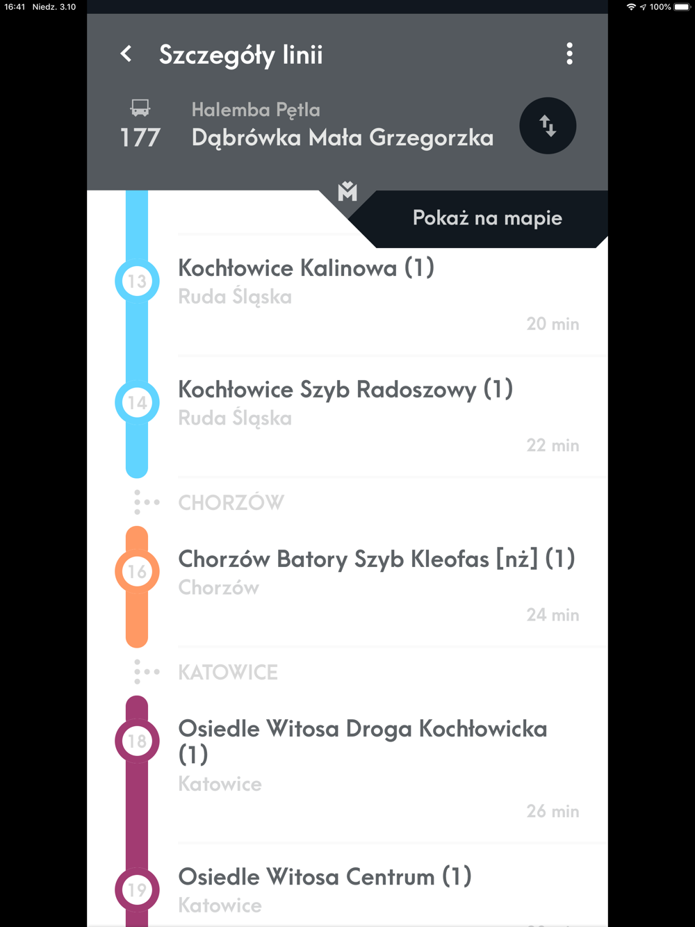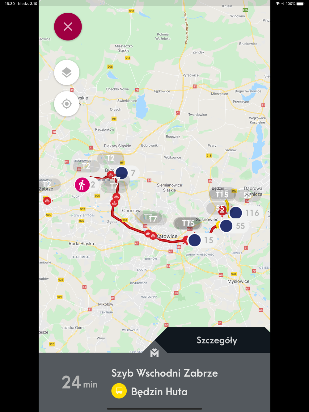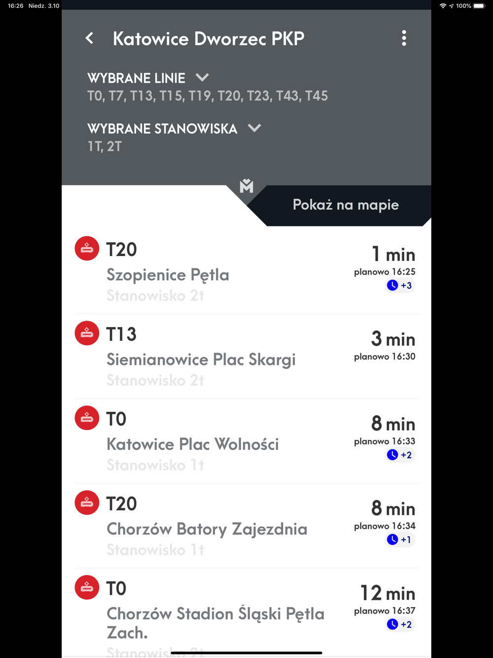W aplikacji prezentowana jest również bieżąca lokalizacja wszystkich pojazdów na podkładzie mapy obejmującej obszar, na którym organizatorem komunikacji jest Zarząd Transportu Metropolitalnego wyskalowanej i wycetrowanej w oparciu o współrzędne GPS. Pasażer ma możliwość podglądu bieżącej pozycji konkretnego pojazdu lub pojazdów obsługujących wskazaną przez pasażera linię. Możliwy jest również podgląd bieżącej pozycji wszystkich pojazdów na wskazanym obszarze ograniczonym jedynie możliwością czytelnej prezentacji, na ekranie urządzenia, którym posługuje się pasażer. Aplikacja umożliwia śledzenie pozycji wybranego pojazdu wraz z bieżącą informacją na jego temat: nr linii, numer boczny pojazdu, odchyłki od planowanego rozkładu jazdy - prezentowanej w minutach i w odpowiednim kolorze, uzależnionym od tego czy dany pojazd jest przyspieszony, jedzie o czasie czy też jest opóźniony w stosunku do planowanego rozkładu jazdy. Dodatkowo przy śledzonym pojeździe prezentowana jest informacja o kierunku w jakim się porusza (w postaci strzałki przy symbolu pojazdu lub w formie opisowej jako ostatni przystanek w realizowanym kursie), najbliższym przystanku na trasie oraz czasie jaki upłynął od ostatniego logowania pojazdu w systemie.