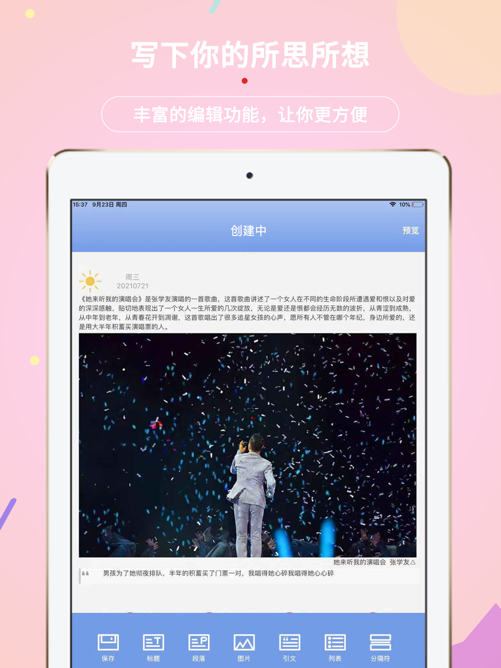"Shell diary" is a rich text editing diary application that supports editing rich elements such as title, picture, text, list, location, weather, etc. It is suitable for keeping a diary to record what you think and feel every day; As a memo, let the good idea not be forgotten; It's really a different taste to write every day and look back after a lot; Organize the activity, call the post and finish it in minutes. It has universal functions and can be used for a variety of needs.