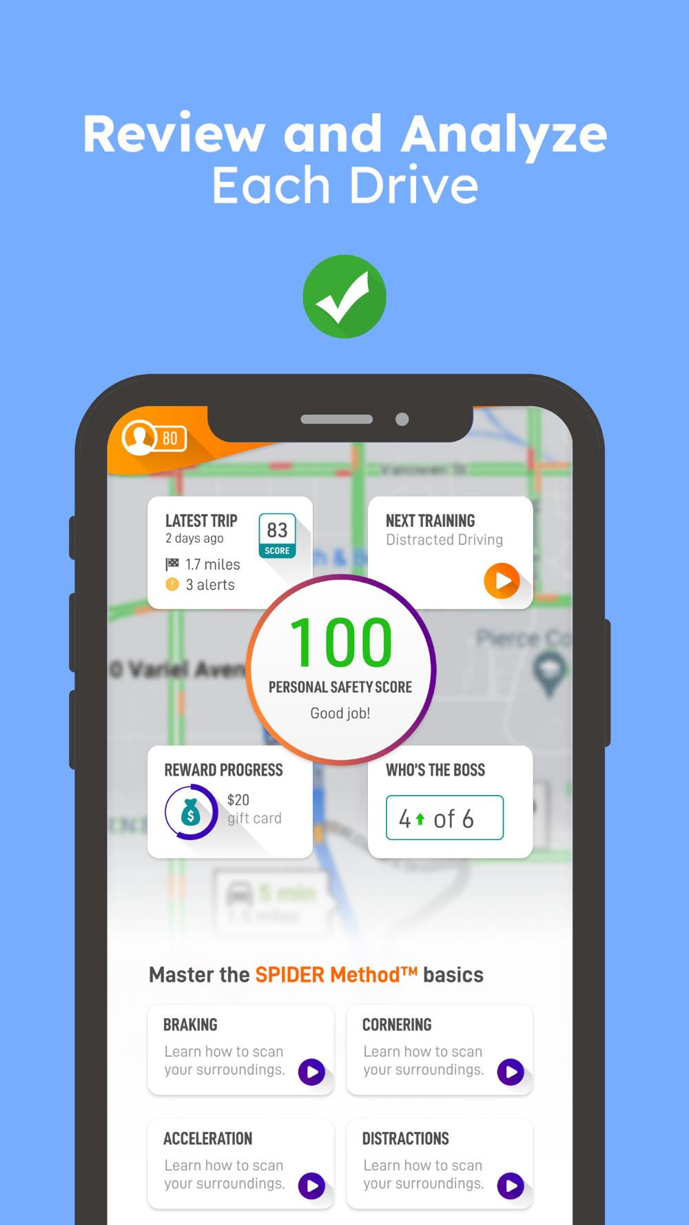 The coach helps teen drivers and their parents (mentors) understand their safe driving strengths and weaknesses and improve their driving by analyzing their driving patterns and providing feedback with each trip. For areas that need improvement, the Coach suggests short S.P.I.D.E.R. driver's ed videos and game-like training modules bespoke to their needs.