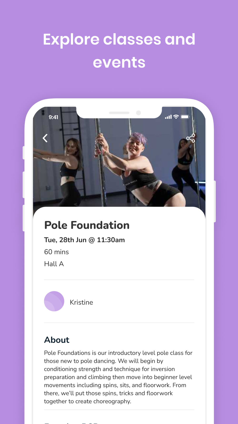 Download our app to sign up for your favorite classes in pole dance, pole tricks, heels choreography, and active flexibility! You can also book workshops and series, request private lessons and parties, and access on-demand courses.
