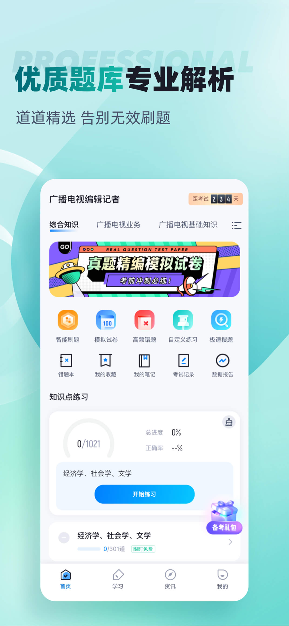 编辑记者题库内含考点练习,全国通用卷以及地区卷模拟练习,以及按照固定考试比重的随机式的抽题的真题考场,成绩单实时记录考试数据,一点一滴的反馈考生近期学习状态以及自我正确率的提升,大大的给予考生通过考试的信心。