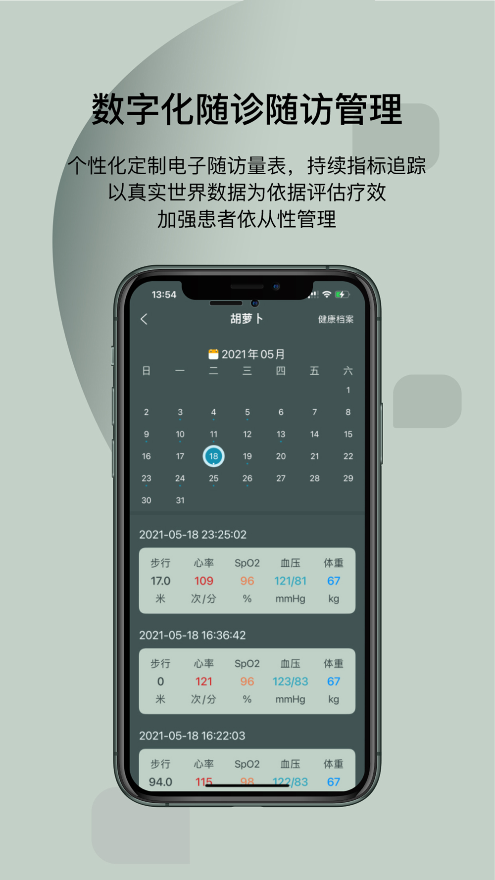【数字化辅助治疗随访】首个移动端数字化心肺评估功能。个性化定制,按组分发,帮助医生院外锁定患者,长期管理便捷; 个性化设置,数据异常及时预警,管理患者更轻松;全周期关键指标及用药记录,疗效追踪一目了然