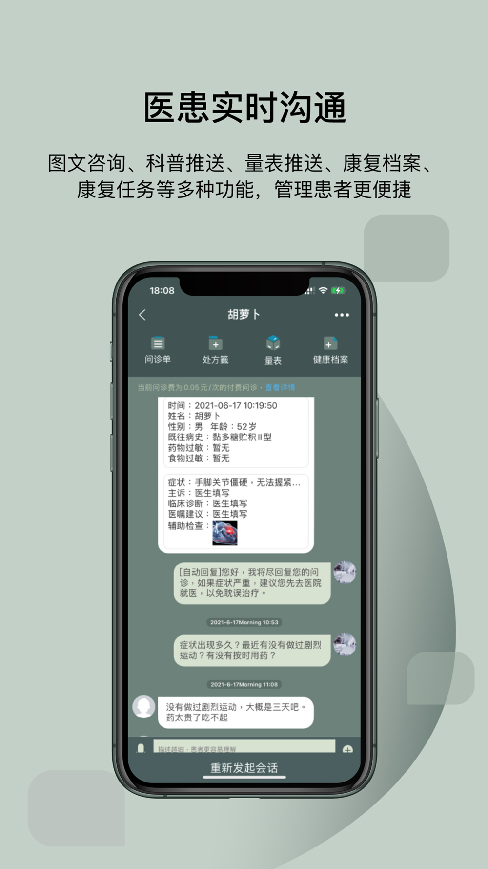 【在线接诊】随时在线查看和回复患者咨询及处方开药、报告解读。