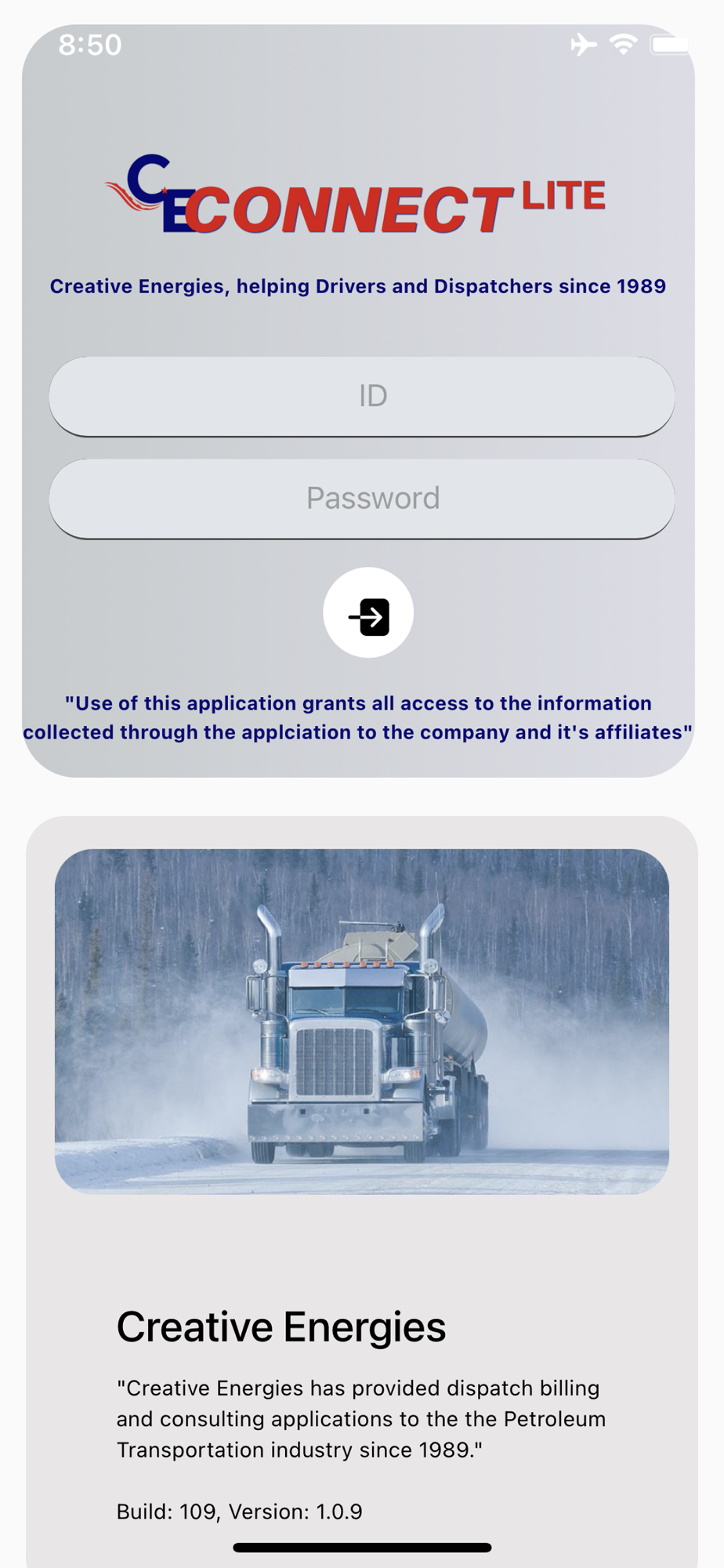 Creative Energies CONNECT! Mobile Application allows for Truck and Driver connectivity to the CE Total Dispatch System, from the field. This application is simple so your Drivers will easily update your company's workflow in real-time.