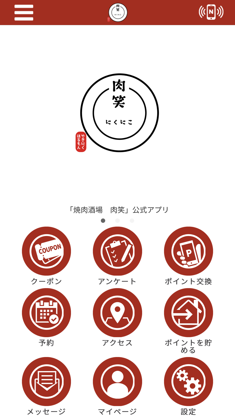 このアプリでは、にくにこの最新情報の受け取りや便利な機能を使う事ができます。