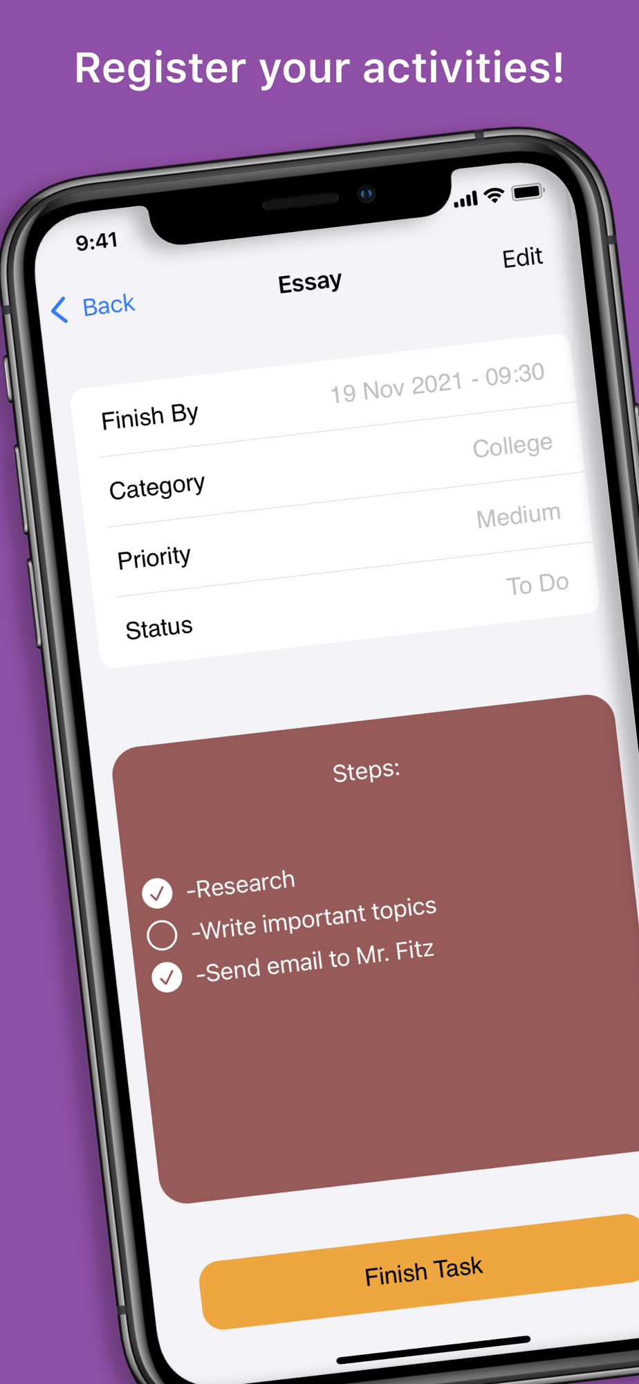 You will be able to register the tasks you have to do and schedule your breaks while doing that task.