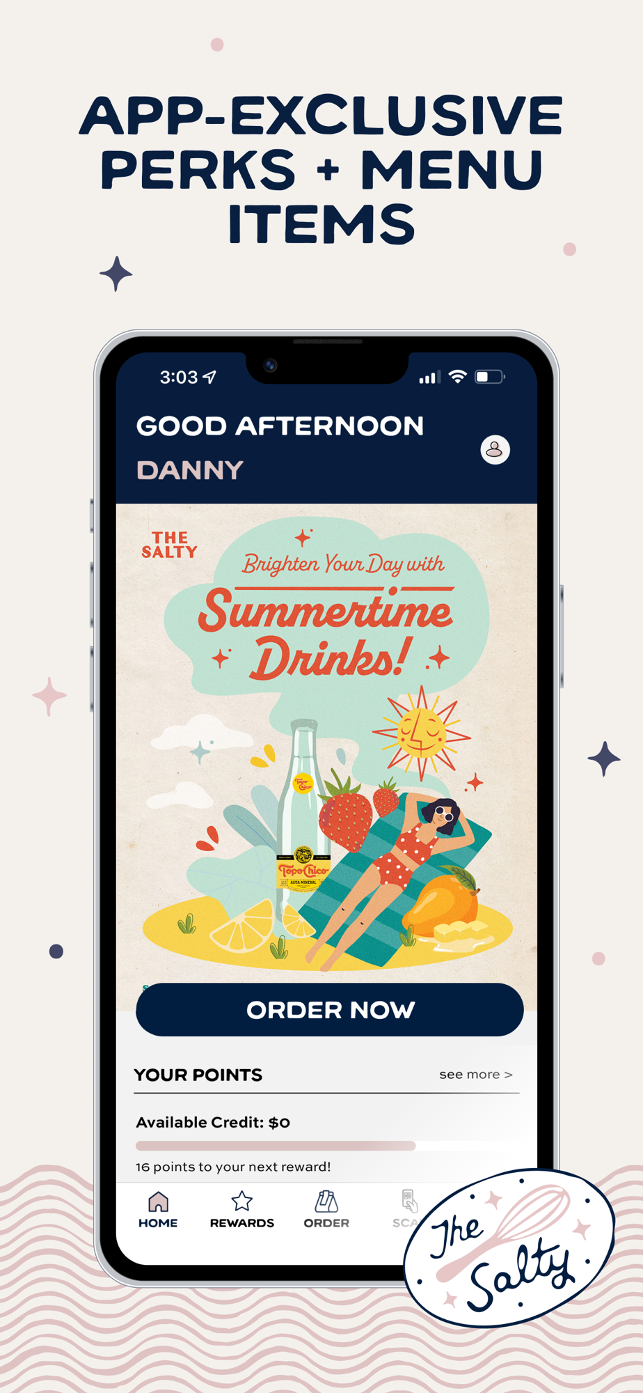 The Salty app is the most convenient way to order ahead for pickup + delivery, scan to pay in-store, and unlock exclusive perks + rewards.