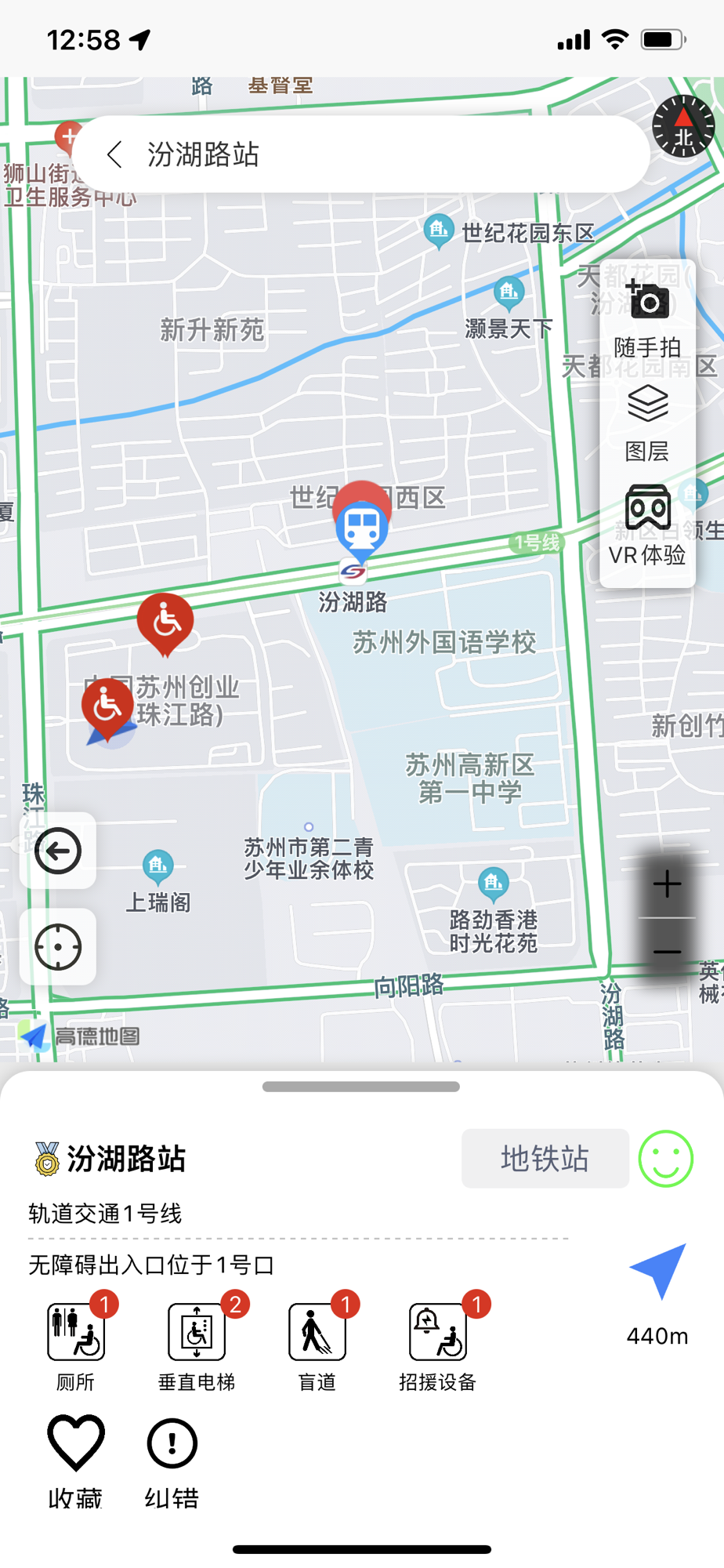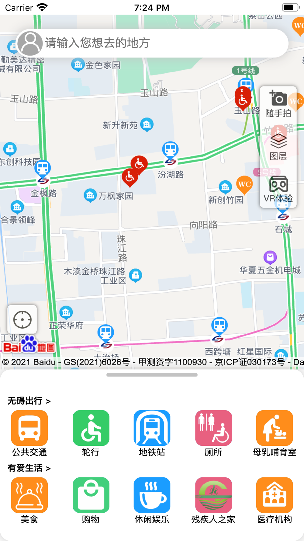 通过本平台查找指定地点,即可获取该区域或地点的无障碍设施详细情况及周边无障碍设施分布情况,例如地铁站、机场、火车站、汽车站、购物中心、政务服务中心等地点的无障碍设施。
